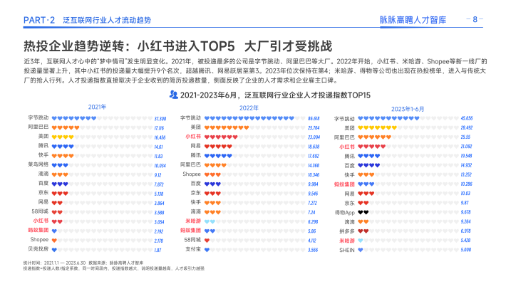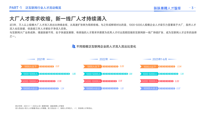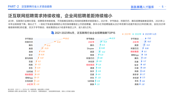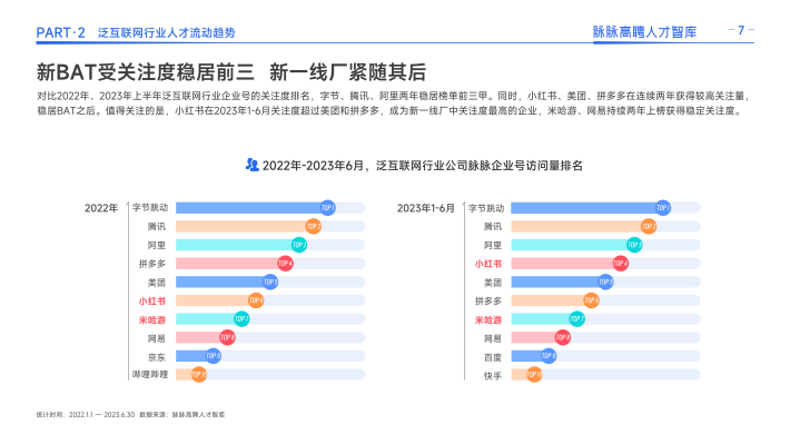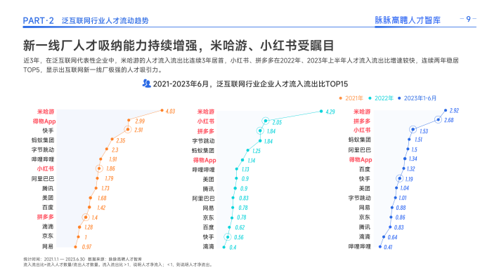 同时,互联网人才迁徙呈现两大明显特征:一是人才竞争格局重塑,大厂扩张按下暂停键,不再高薪囤人,一些优秀的人才离开大厂,寻找更加适合自己发展的平台。其次,互联网行业正在分化出「新一线」阵营。一些仍处于高速发展期的公司,凭借强劲的业务增长势头和发展机会,对人才的吸引力正在赶超大厂。以小红书、米哈游为代表的新一线厂逆势扩张,凭借高薪获得大量人才关注和投递,连续三年人才净流入,成为上半年互联网人才尤其是五年以上职龄人才的热投企业。