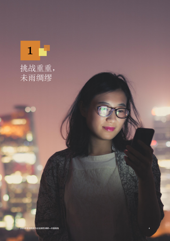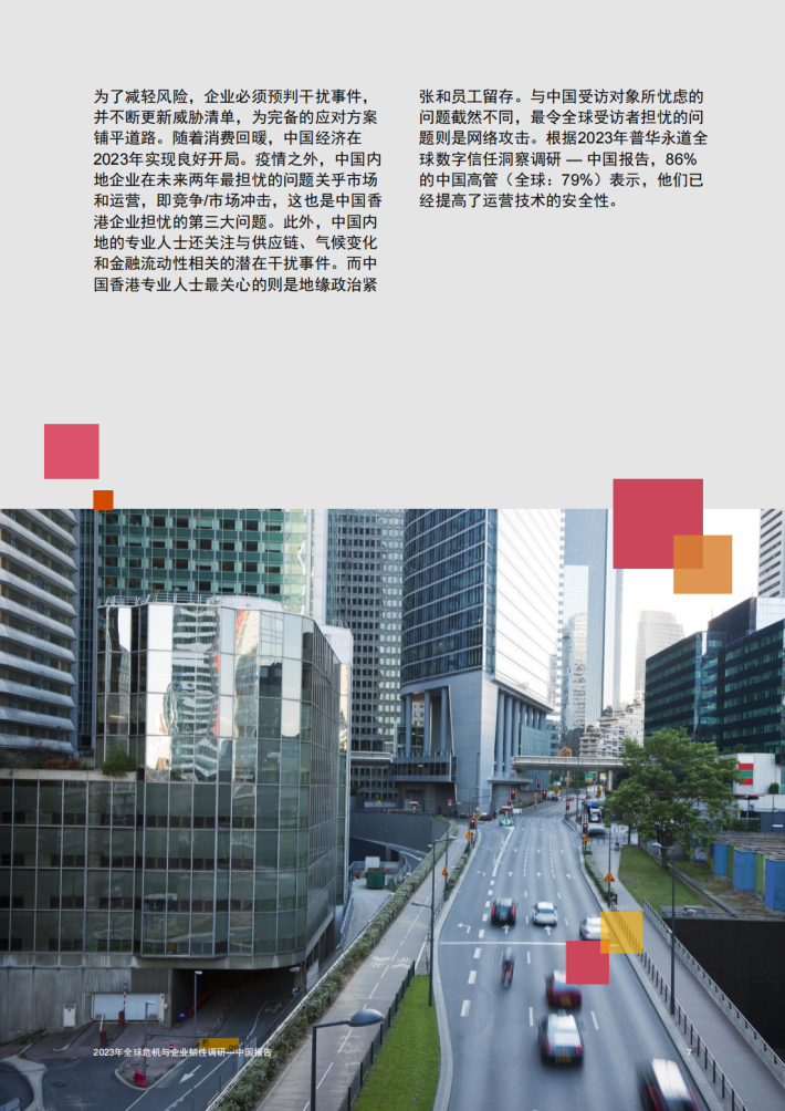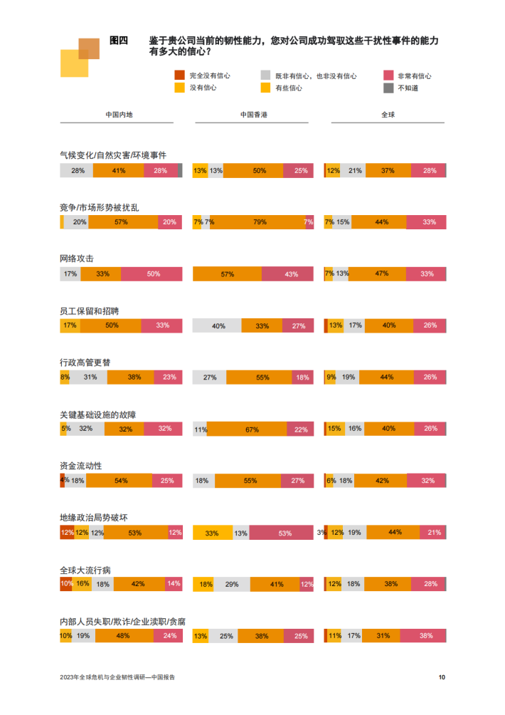 中国企业正在此风高浪急的时代中奋楫航行。96%的受访中国内地企业和98%的受访中国香港企业表示在过去两年里遭遇了干扰。和全球同行一样,中国企业在过去的三年中加速转型以抵御风险挑战。随着一系列政策措施的出台实施,国内企业充满信心并期待经济复苏。同时,中国商业领袖也发现,包括气候变化、全球供应链危机、地缘政治紧张和网络安全在内的宏观因素为风云变幻的商业环境更添复杂。