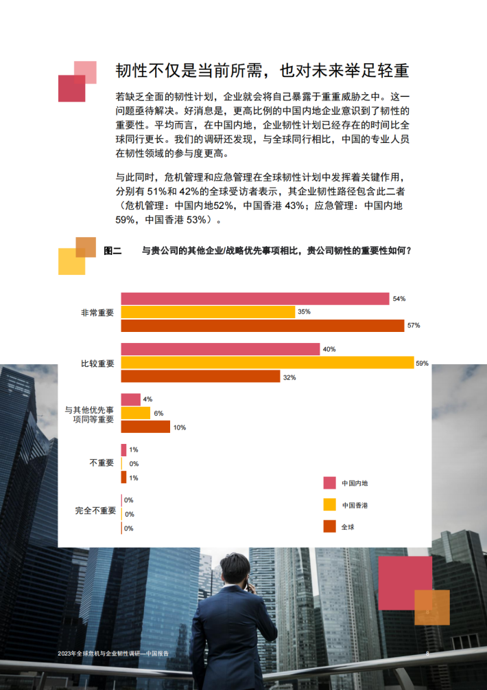 2023年全球危机与企业韧性调研汇集了1,812名来自不同部门和团队的专业人士的看法,涉及信息技术、财务、业务连续性和风险管理等专业背景。 中国报告体现了中国内地和中国香港165名专业人士的观点,其中53%代表私营企业,39%代表上市公司,7%代表政府机构。从行业来看,36%来自制造业和汽车行业,20%来自金融服务业,12%来自消费市场,11%来自科技、媒体和通信业,8%来自医疗健康业,6%来自能源业,6%来自政府及公共服务业。在本报告中,有关“中国”的描述皆包含中国内地与香港特别行政区的数据。如果两者的调研结果在统计学意义上存在显著差异,则将结果分别列示。