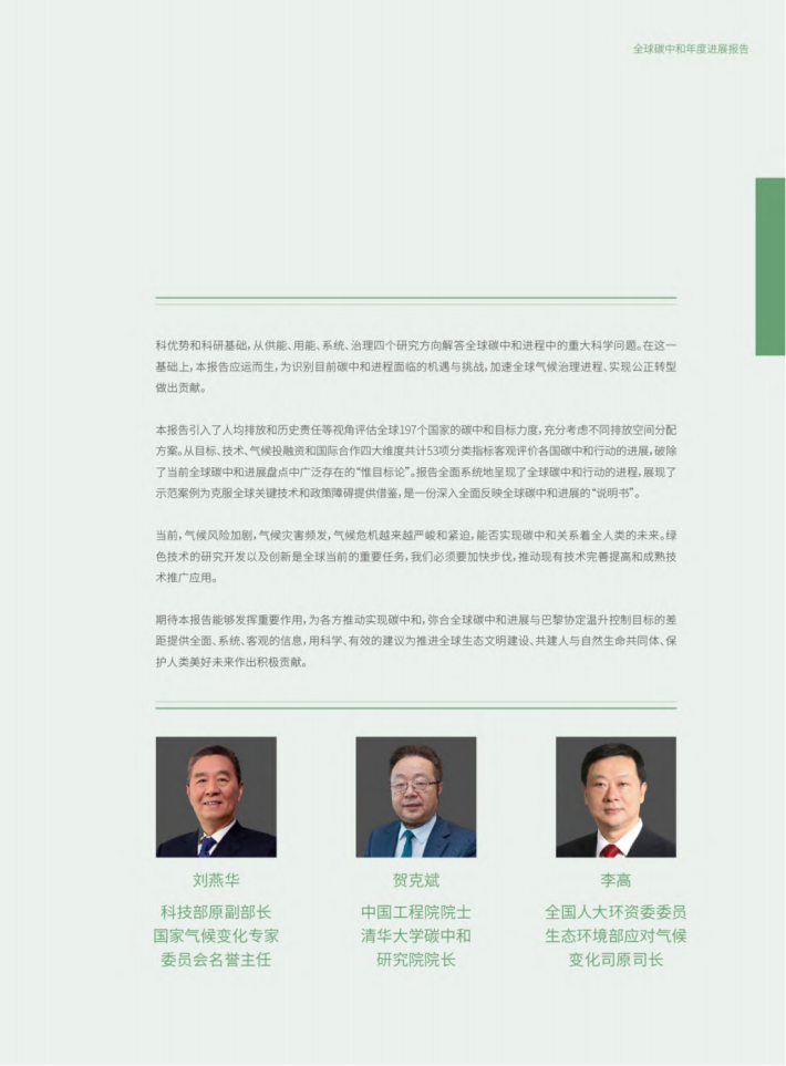 期待本报告能够发挥重要作用,为各方推动实现碳中和,弥合全球碳中和进展与巴黎协定温升控制目标的差距提供全面、系统、客观的信息,用科学、有效的建议为推进全球生态文明建设、共建人与自然生命共同体、保护人类美好未来作出积极贡献。