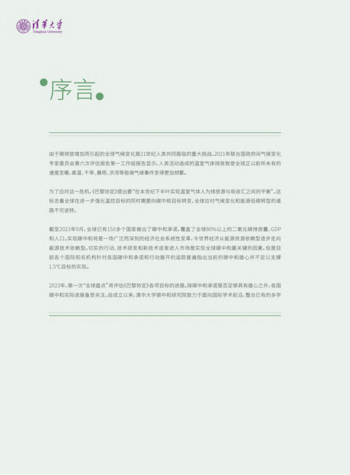 2023年,第一次“全球盘点”将评估《巴黎协定》各项目标的进展。除碳中和承诺是否足够具有雄心之外,各国碳中和实际进展备受关注。自成立以来,清华大学碳中和研究院致力于面向国际学术前沿,整合已有的多学科优势和科研基础,从供能、用能、系统、治理四个研究方向解答全球碳中和进程中的重大科学问题。在这一基础上,本报告应运而生,为识别目前碳中和进程面临的机遇与挑战,加速全球气候治理进程、实现公正转型做出贡献。