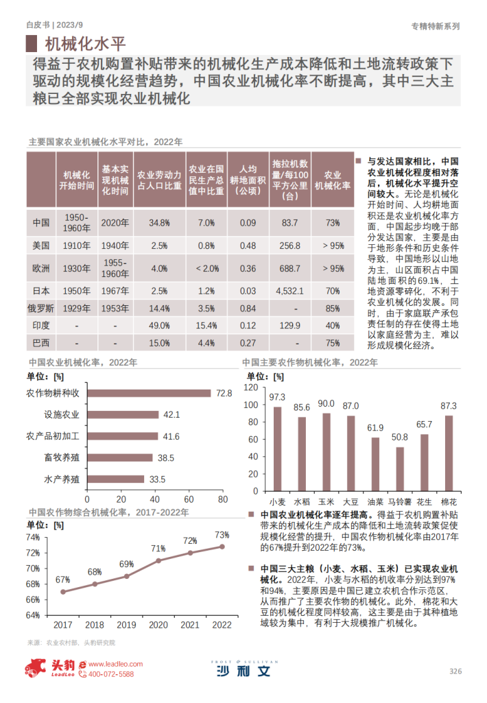 行业市场规模由3,911亿元增长到5,575.5亿元,复合增长率达7.9%。2022年,中国农作物综合机械化率为73%,与发达国家相比,仍存在差距。