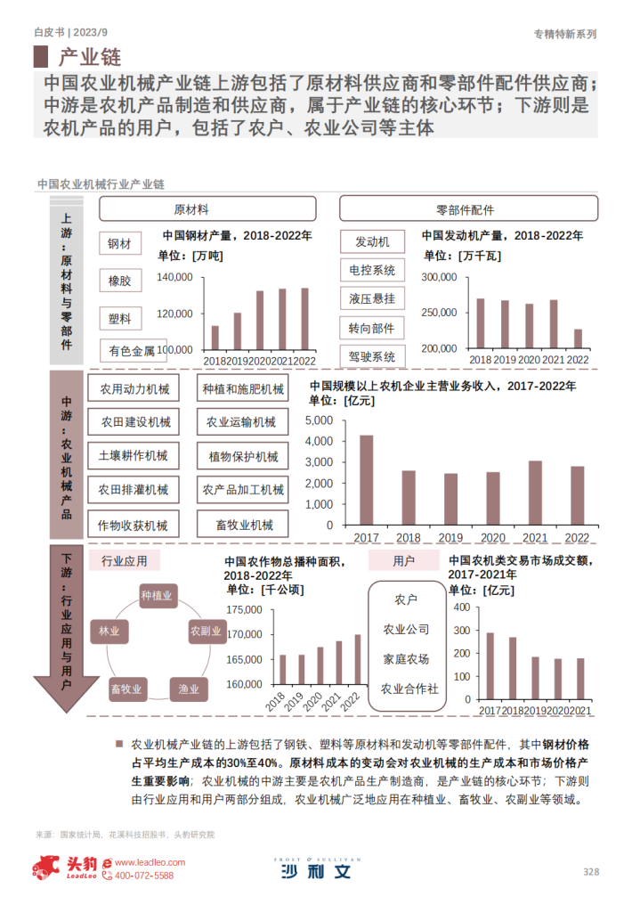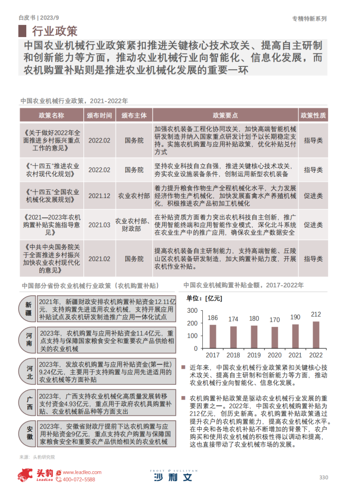 得益于农机购置补贴带来的机械化生产成本降低和土地流转政策下驱动的规模化经营趋势,农机行业市场规模持续扩大,中国农业机械化率不断提高。2017-2022年,中国农业机械