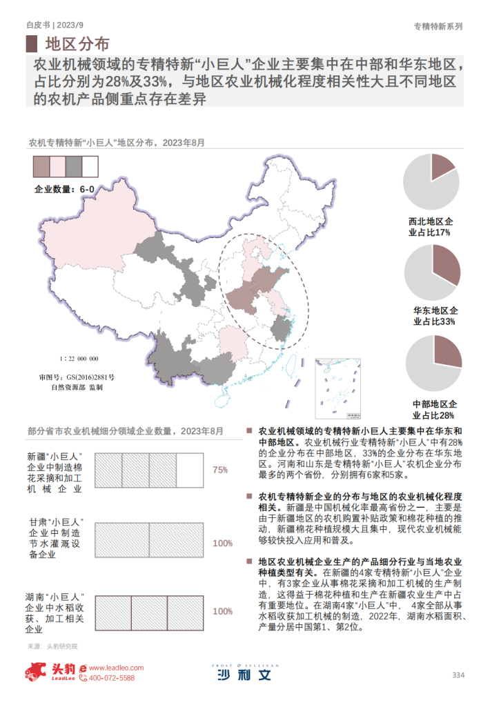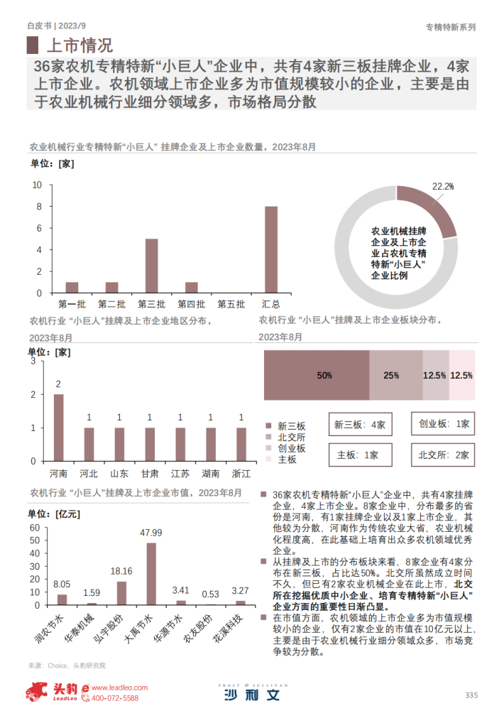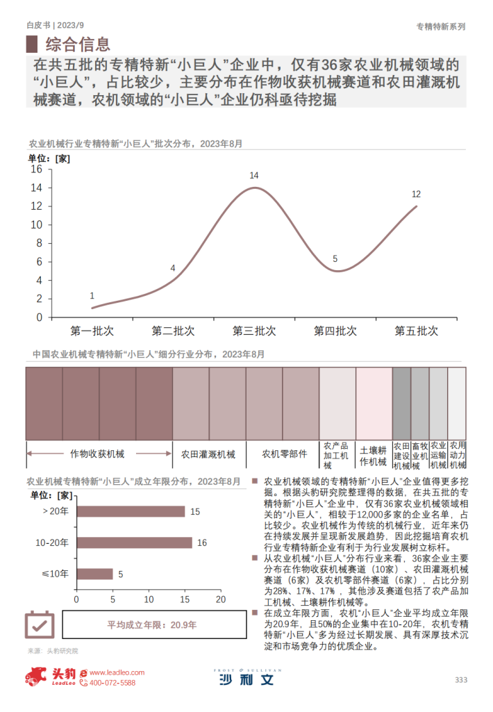 在五批的专精特新“小巨人”企业中,仅有36家为农业机械领域的“小巨人”企业,相较于12,950家的企业名单,占比处于低位。农业机械作为传统的机械行业,近年来仍在持续发展并呈现新发展态势,因此挖掘培育农机行业专精特新企业有利于为行业发展树立标杆,带动行业整体向好发展。