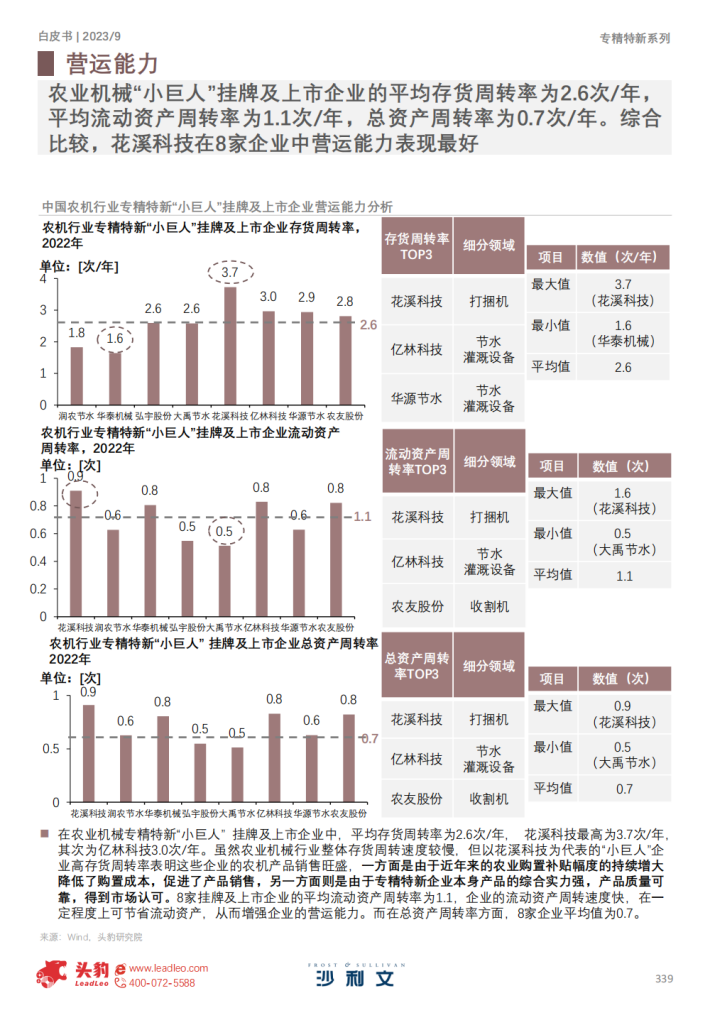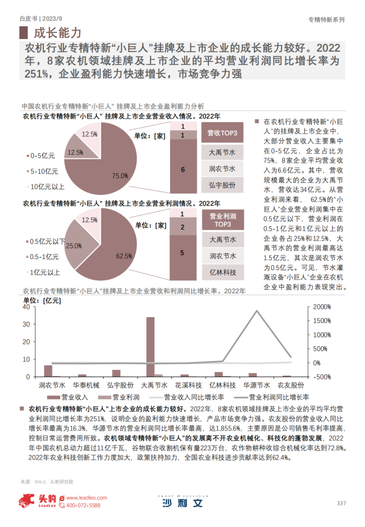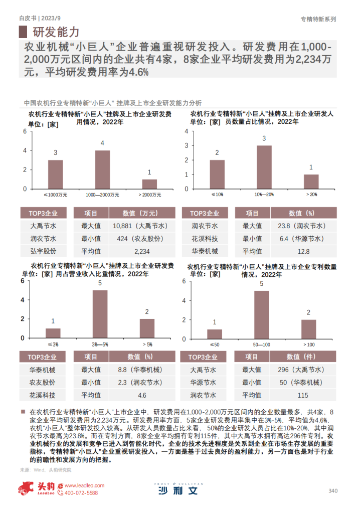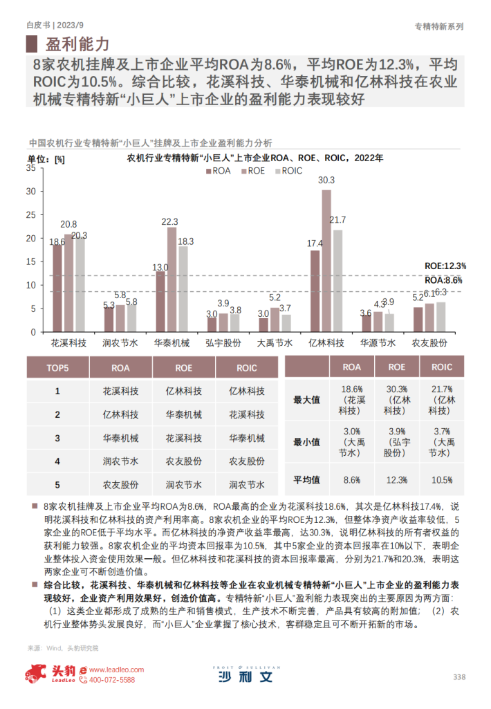 农业机械“小巨人”企业发展规划明确,普遍重视研发投入,成长能力和盈利能力表现较佳。2022年,8家农机领域挂牌及上市企业平均ROA为8.6%,平均ROE为12.3%,平均ROIC为10.5%。2022年,8家企业平均研发费用为2,234万元,平均研发费用率为4.6%。