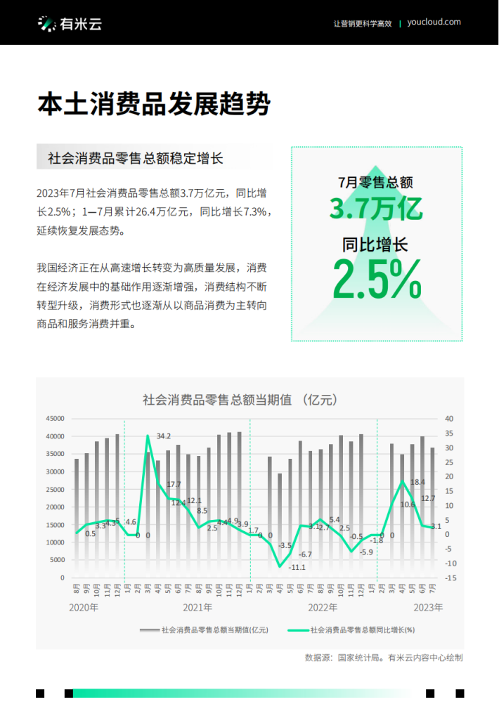 2023年7月社会消费品零售总额3.7万亿元,同比增长2.5%;1-7月累计26.4万亿元,同比增长7.3%,延续恢复发展态势。