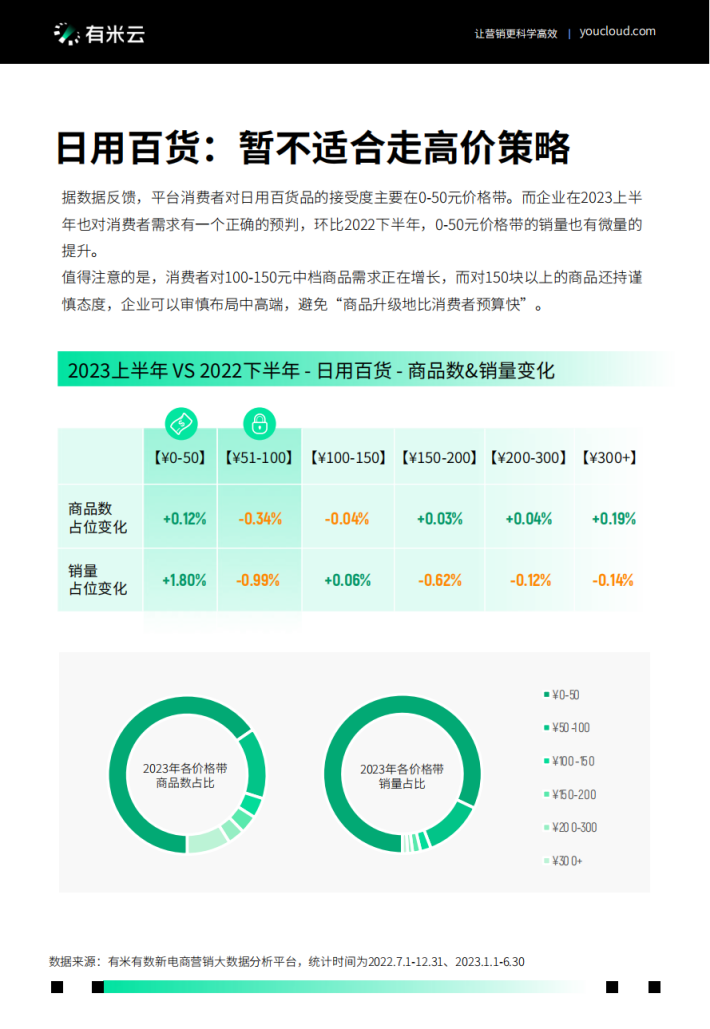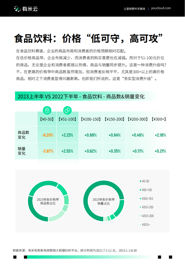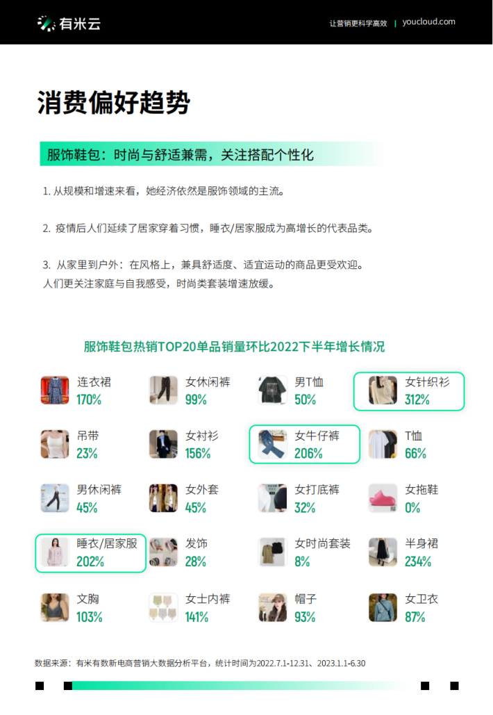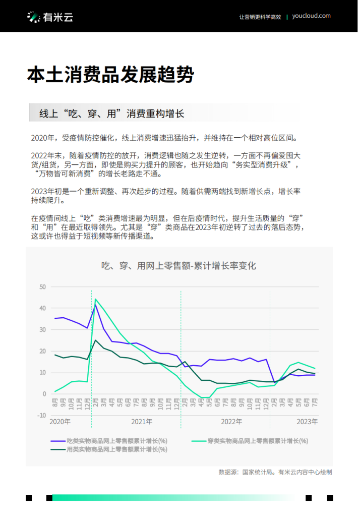 在疫情间线上“吃”类消费增速最为明显,但在后疫情时代,提升生活质量的“穿”和“用”在最近取得领先。尤其是“穿”类商品在2023年初逆转了过去的落后态势,这或许也得益于短视频等新传播渠道。