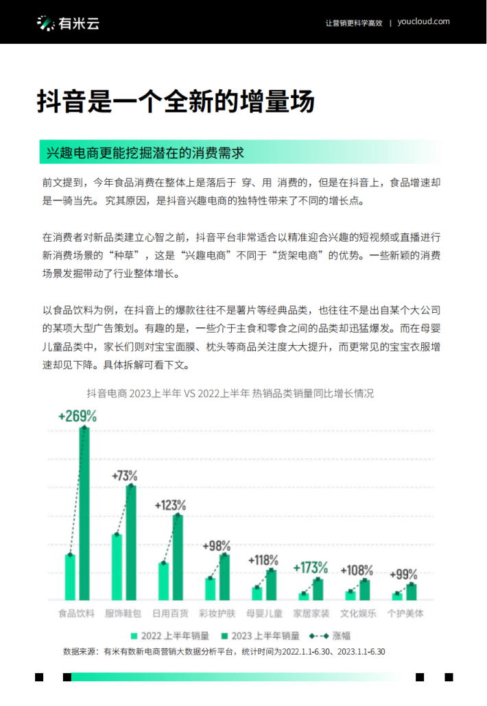 在消费者对新品类建立心智之前,抖音平台非常适合以精准迎合兴趣的短视频或直播进行新消费场景的“种草”,这是“兴趣电商”不同于“货架电商”的优势。一些新颖的消费场景发掘带动了行业整体增长。