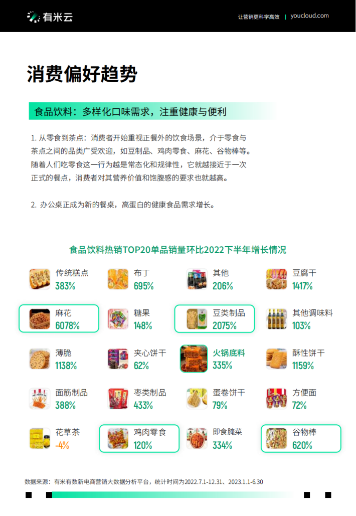 以食品饮料为例,在抖音上的爆款往往不是薯片等经典品类,也往往不是出自某个大公司的某项大型广告策划。有趣的是,一些介于主食和零食之间的品类却迅猛爆发。而在母婴儿童品类中,家长们则对宝宝面膜、枕头等商品关注度大大提升,而更常见的宝宝衣服增速却见下降。