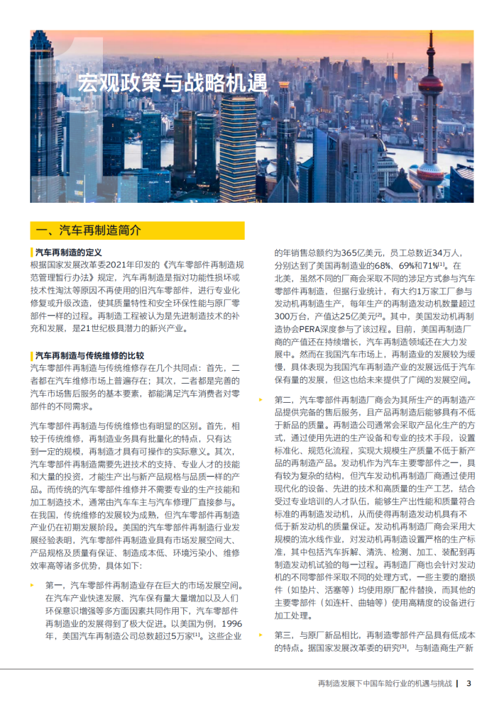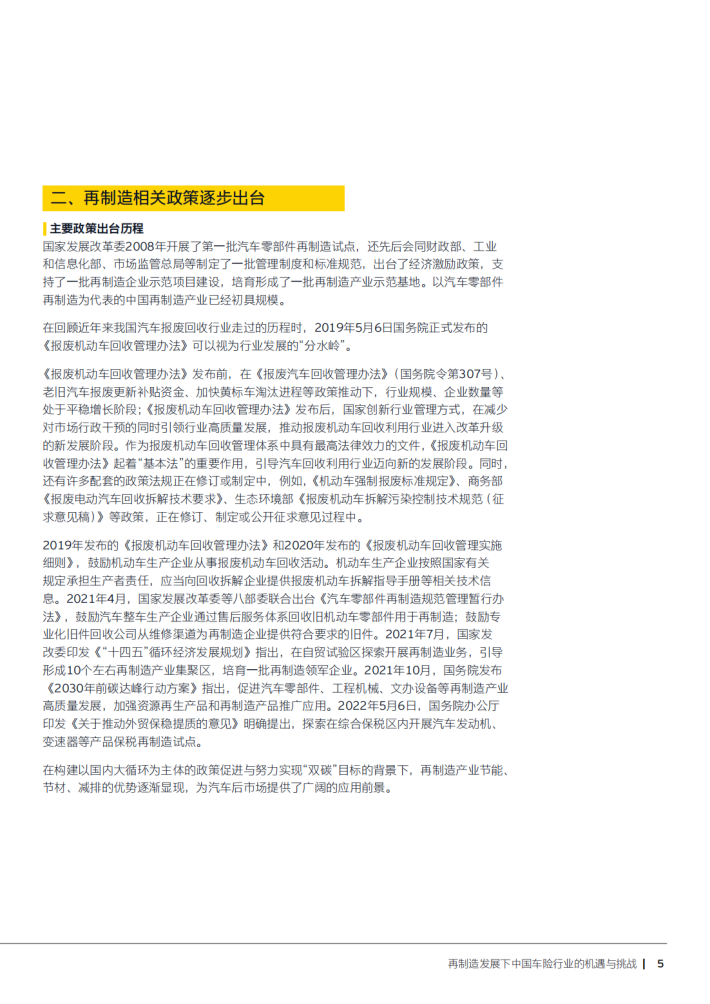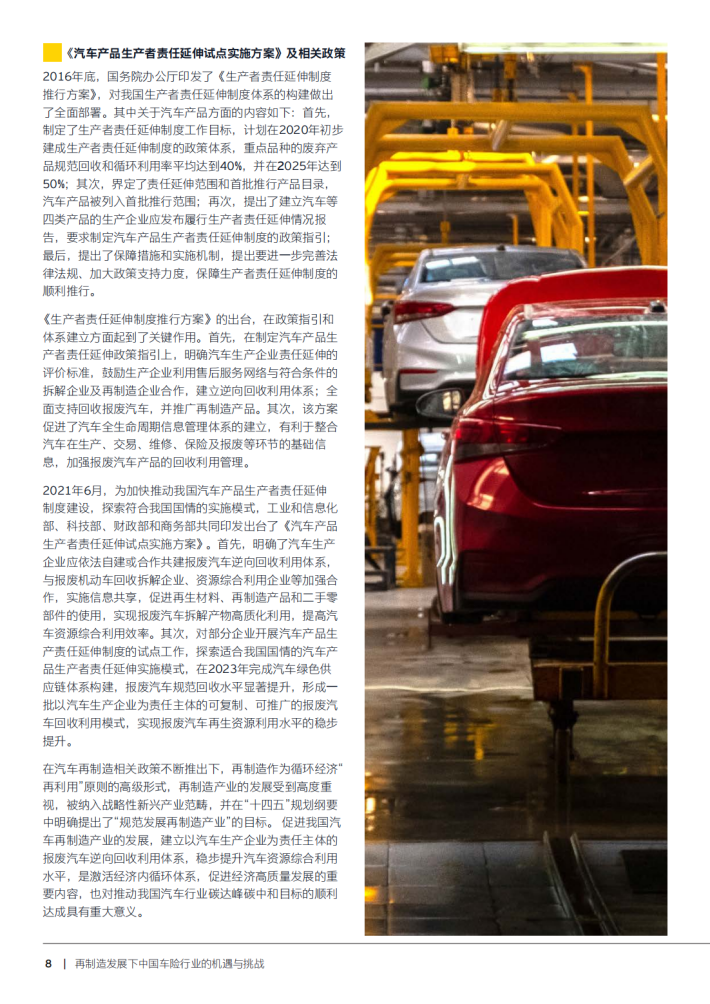 本文阐述了汽车再制造发展下中国车险行业的机遇与挑战。随着我国“双碳”目标的提出,再制造是环保和节约资源的重要手段,对于中国保险业来说,也是一个新的发展契机。再制造的发展离不开政策的扶持,我国出台了一系列的政策支持产业发展,包括相关国家标准、行业标准,推进了汽车零部件再制造产业的发展,而在这一过程中保险业的地位和作用凸显。这将促进汽车再制造市场逐渐规范,有序推动汽车零部件再制造行业的发展。