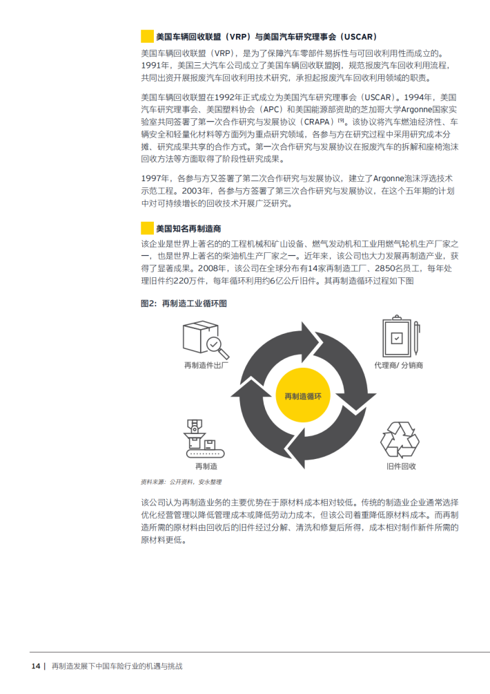借鉴国外发展经验,结合国内实际,汽车再制造产业与车险行业的协作将是多维度的。首先,它离不开政策的支持和扶植,也需要消费者和社会大众对绿色环保概念的认同。其次,车险公司理赔案中的废旧零件给汽车再制造行业提供了稳定的生产原材料,而再制造件给车险公司提供了高性价比维修方案,降低了车险公司的理赔成本,也给车险消费者提供了不同维修方案。再次,再制造行业本身也需要保险的支持,在产品、资金、法律和信誉风险方面都需要有保险公司的参与,再制造产品质量责任险也将提振消费者对再制造件的信心。最后,国内再制造企业水平仍旧参差不齐,缺乏足够资金投入,参与各方如何找到利益契合点还需要进一步磨合。