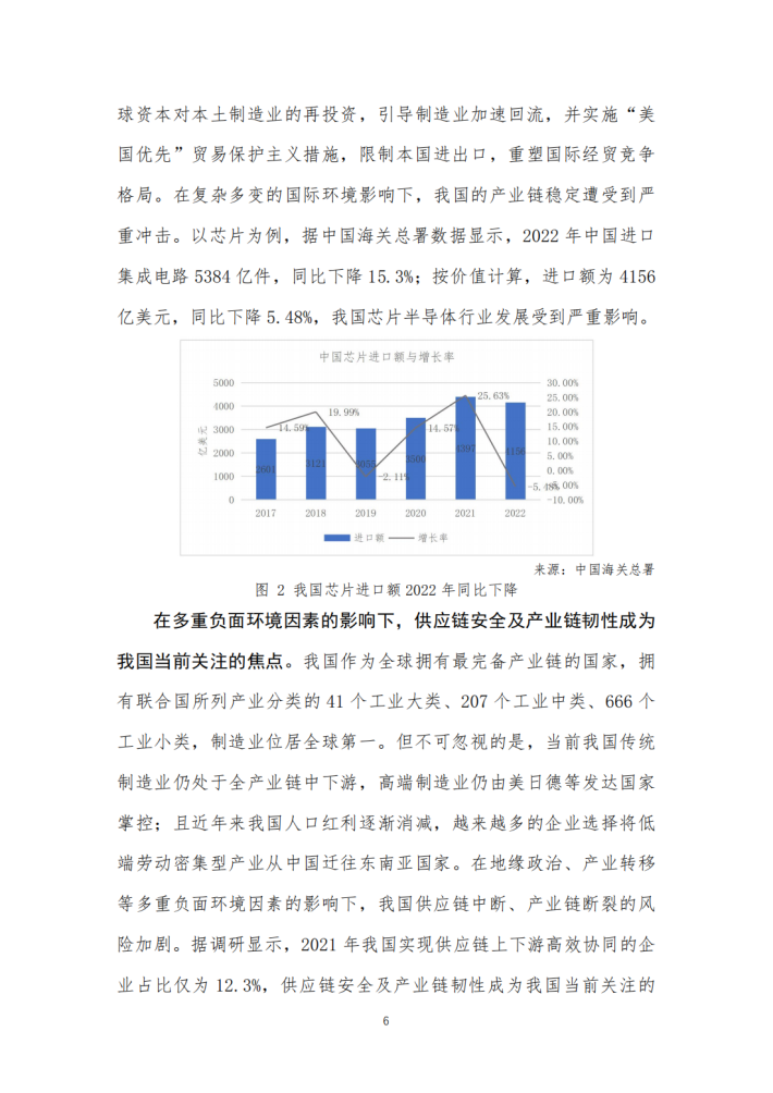 当今世界正经历百年未有之大变局,黑天鹅、灰犀牛事件频发,掀起了逆全球化的浪潮、加剧了全球产业链的物理性隔离,造成了全球资源的结构性短缺、多重挑战为国民经济韧性增长带来严峻考验。产业链供应链作为全球经济一体化的产物,已然受到上述时代发展问题的波及,“断链”、“缺链”现象时有发生。面对时代发展中的挑战,只有安全稳定的产业链供应链,才能有效应对复杂多变的国内外政治经济环境。