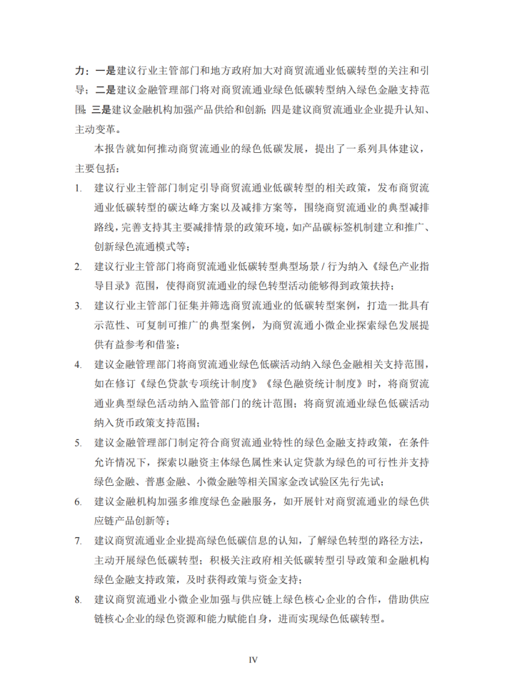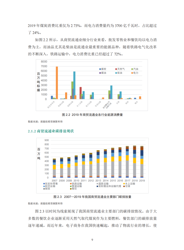 为了更好地支持商贸流通业的低碳转型,本报告从理论和实践两方面出发,探讨商贸流通业低碳转型在推动经济社会绿色转型中的重要作用和典型场景。在理论方面,报告以商贸流通业自身节能减排的量化效果及其对我国整体节能减排的理论传导效应为核心目标,结合减碳计算方法和行业数据,以数值结果为基础,根据不同的应用场景、中小微企业的不同参与程度以及国家政策力度的差异,设计相应的减排方案,并计算出商贸流通业采用节能减排举措对自身的减碳效果及其对供应链上游各行业的累积减碳传导效应,以凸显商贸流通业节能减排对国民经济的重要意义。在实践方面,报告在理论研究的基础上,梳理筛选出四个商贸流通业支持生产和消费领域绿色低碳发展的典型场景,通过资料分析和调研采访等方式,以具体的实践案例加以展现,并从中总结出目前商贸流通业绿色低碳发展的主要问题。