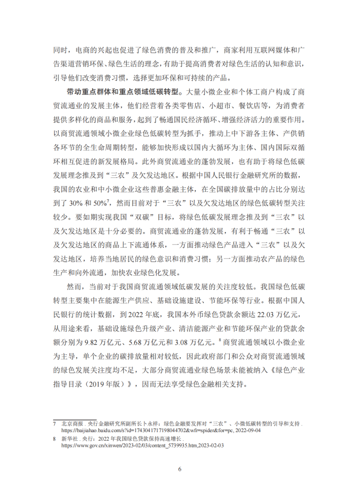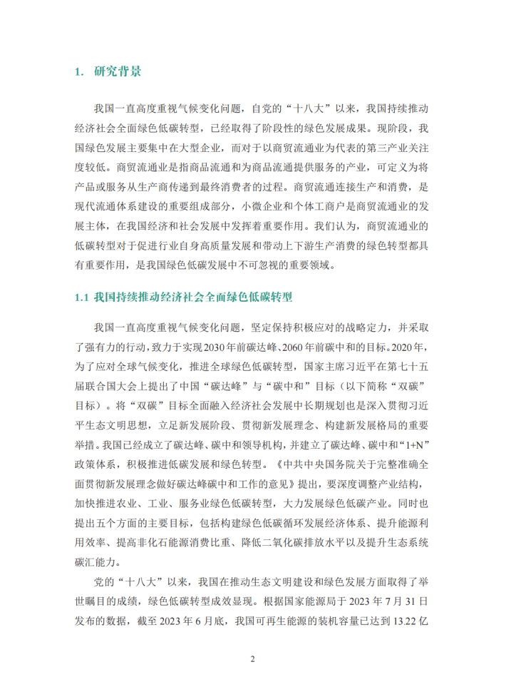 商贸流通业是我国绿色低碳发展中不可忽视的重要领域,但当前缺乏足够的关注和引导。近年来,我国采取强有力的行动来应对气候变化,已初步构建完成碳达峰碳中和“1+N”政策体系,并在能源绿色低碳转型、节能降碳增效等方面取得了显著成效。但目前我国绿色低碳转型主要集中于生产制造业中的大型企业,未来则需要关注如何进一步推广并提升转型成效,促进生产方式和生活方式的绿色低碳转型。商贸流通业是商品流通和为商品流通提供服务的产业,主要包括批发和零售贸易业、餐饮业、仓储业、邮政业及交通运输业等行业。小微企业和个体工商户是商贸流通业的发展主体。商贸流通业的低碳转型对于促进行业自身高质量发展和带动上下游生产消费绿色转型具有重大意义,是我国绿色低碳发展中不可忽视的重要领域。然而,当前我国商贸流通领域低碳发展的受关注程度较低,针对该产业碳排放、碳减排的研究尚浅,商贸流通业低碳转型的典型场景不够清晰,相关市场主体亦缺乏引导。