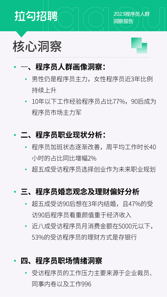报告内容主要基于拉勾招聘平台海量数字科技人才大数据库以及771名程序员的调研结果,从程序员的人群画像、职业发展、婚恋状况以及理财等多方面分析程序员的职场和日常生活。