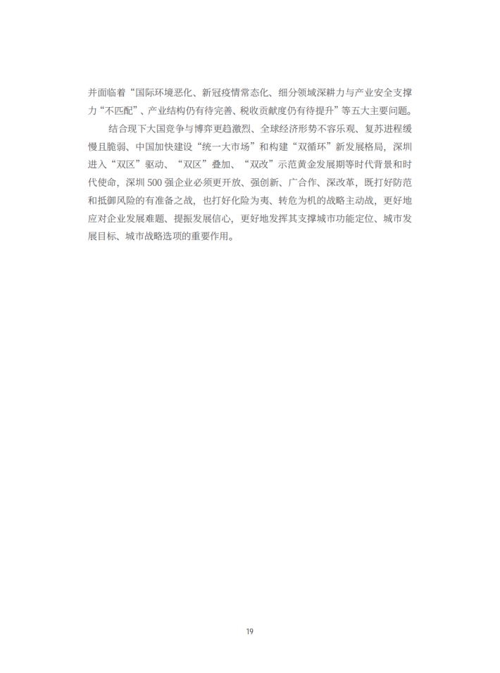 结合现下大国竞争与博弈更趋激烈、全球经济形势不容乐观、复苏进程缓慢且脆弱、中国加快建设“统一大市场”和构建“双循环”新发展格局,深圳进入“双区”驱动、 “双区”叠加、 “双改”示范黄金发展期等时代背景和时代使命,深圳500强企业必须更开放、强创新、广合作、深改革,既打好防范和抵御风险的有准备之战,也打好化险为夷、转危为机的战略主动战,更好地应对企业发展难题、提振发展信心,更好地发挥其支撑城市功能定位、城市发展目标、城市战略选项的重要作用。