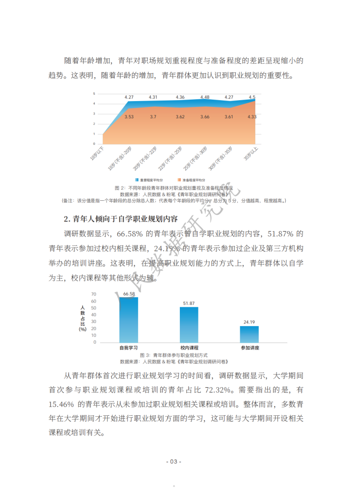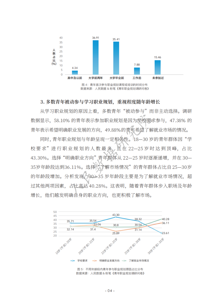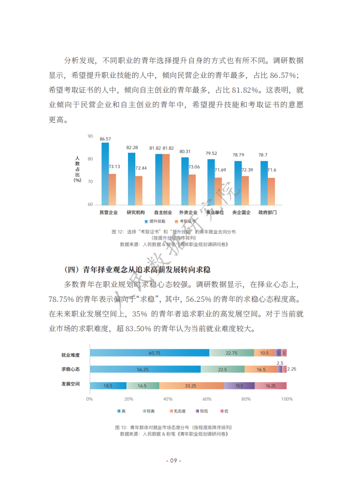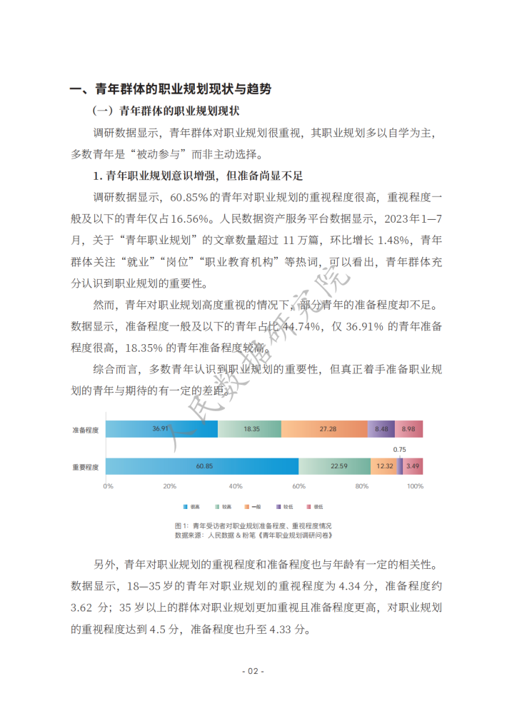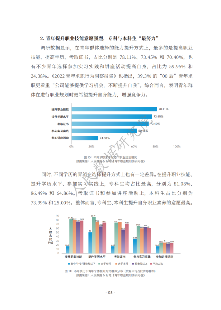 《新时代的中国青年》白皮书指出,青年的职业选择丰富多元,日益市场化、多元化、自主化。相关报道认为,在就业市场不断变化的当下,青年群体在择业上更趋向于稳健,考公务员、考教师资格证、考事业单位等成为不少青年的热门选择。在该过程中,青年群体选择职业培训教育机构等平台提升自己应对职场的能力,如很多青年选择粉笔提高自身考公、考教师、考编方面的能力,找到职业规划的“最优解”;使用智联招聘平台的数据优势和技术优势,提高自己就业能力,发现就业机会等。然而,也有不少青年缺乏职业规划,有研究发现,我国青年群体职业规划意识、相关培训、规划教育的专业性等方面均有待提升。