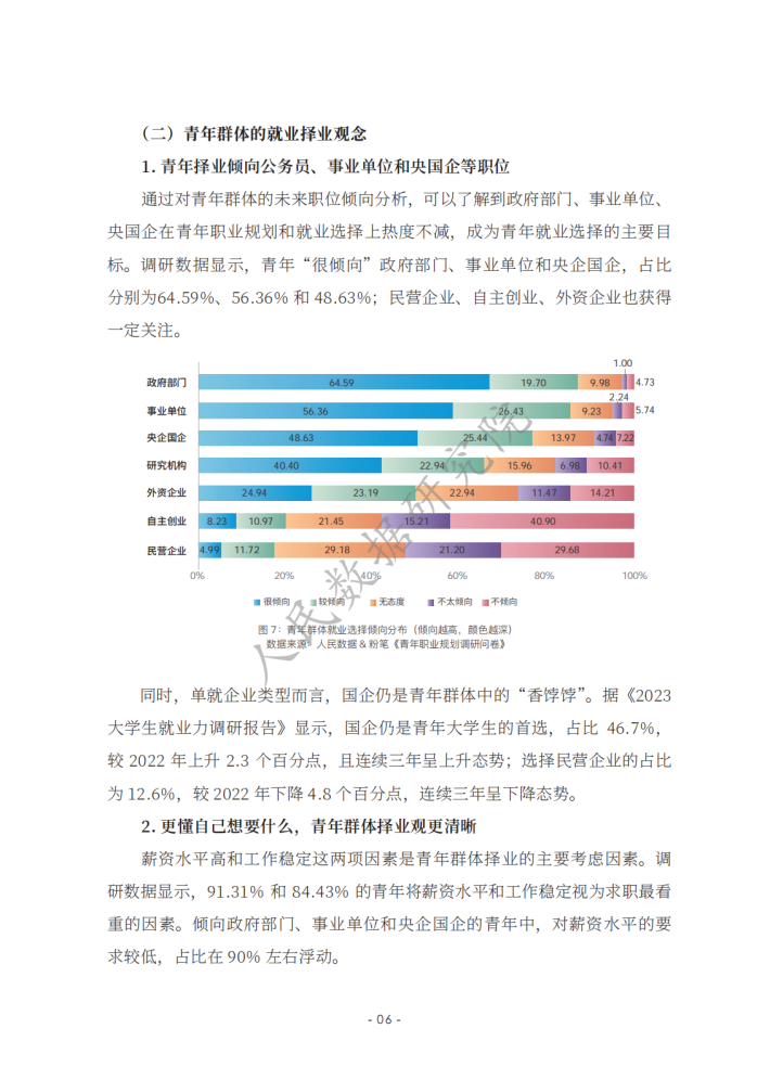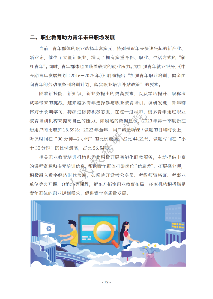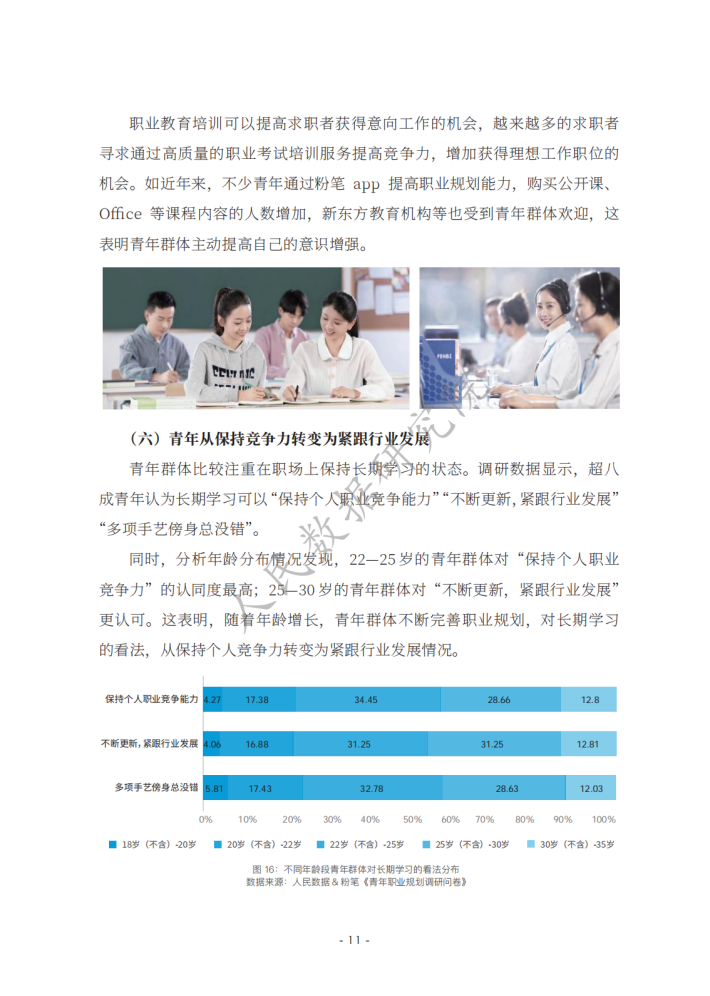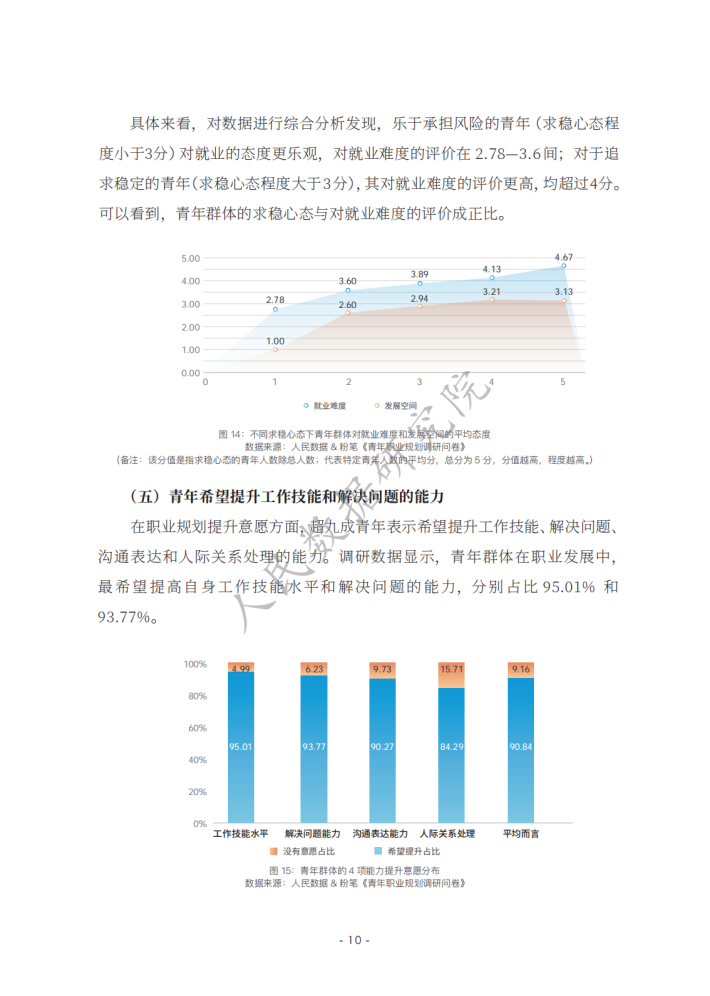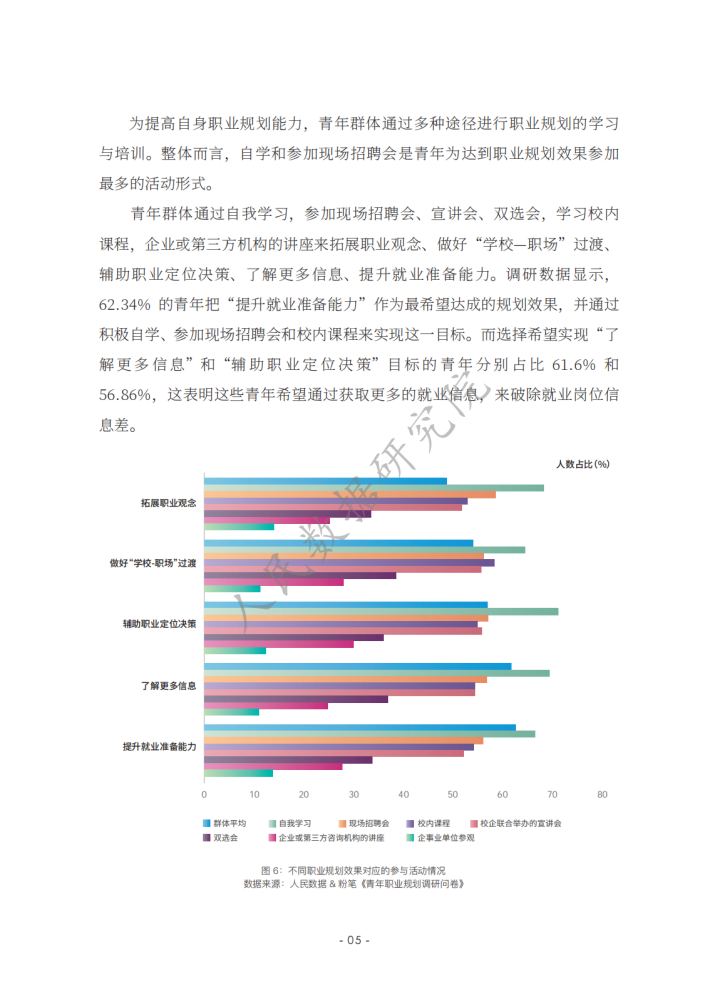 《新时代的中国青年》白皮书指出,青年的职业选择丰富多元,日益市场化、多元化、自主化。相关报道认为,在就业市场不断变化的当下,青年群体在择业上更趋向于稳健,考公务员、考教师资格证、考事业单位等成为不少青年的热门选择。在该过程中,青年群体选择职业培训教育机构等平台提升自己应对职场的能力,如很多青年选择粉笔提高自身考公、考教师、考编方面的能力,找到职业规划的“最优解”;使用智联招聘平台的数据优势和技术优势,提高自己就业能力,发现就业机会等。然而,也有不少青年缺乏职业规划,有研究发现,我国青年群体职业规划意识、相关培训、规划教育的专业性等方面均有待提升。