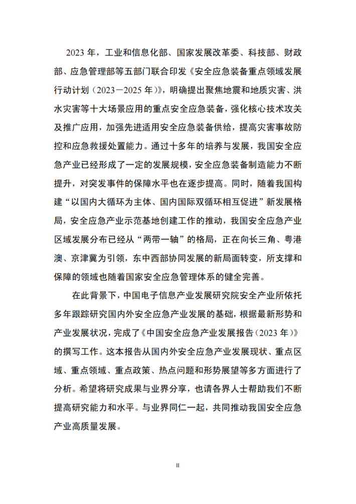 在此背景下,中国电子信息产业发展研究院安全产业所依托多年跟踪研究国内外安全应急产业发展的基础,根据最新形势和产业发展状况,完成了《中国安全应急产业发展报告(2023年)》的撰写工作。这本报告从国内外安全应急产业发展现状、重点区域、重点领域、重点政策、热点问题和形势展望等多方面进行了分析。希望将研究成果与业界分享,也请各界人士帮助我们不断提高研究能力和水平。与业界同仁一起,共同推动我国安全应急产业高质量发展。