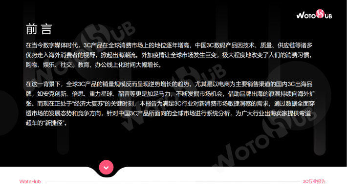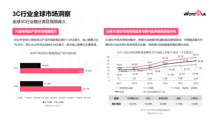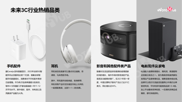 在这一背景下,全球3C产品的销量规模反而呈现逆势增长的趋势。尤其是以电商为主要销售渠道的国内3C出海品牌,如安克创新、倍思、重力星球、韶音等更是加足马力,不断发掘市场机会,借助品牌出海的浪潮持续向海外扩张。而现在正处于“经济大复苏”的关键时刻,本报告为满足3C行业对新消费市场敏捷洞察的需求,通过数据全面穿透市场的发展态势和竞争方向,针对中国3C产品所面向的全球市场进行系统分析,为广大行业出海卖家提供弯道超车的“新捷径”。