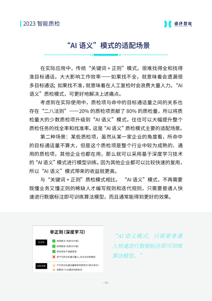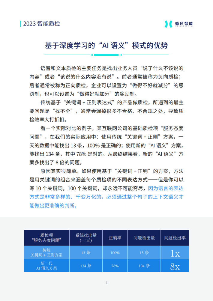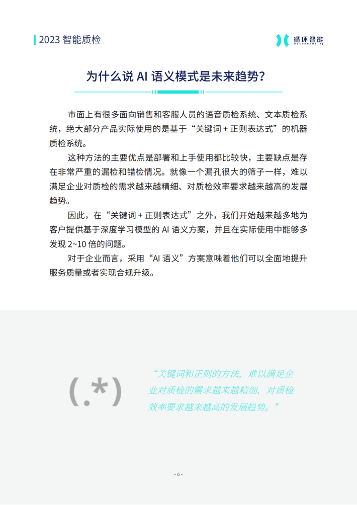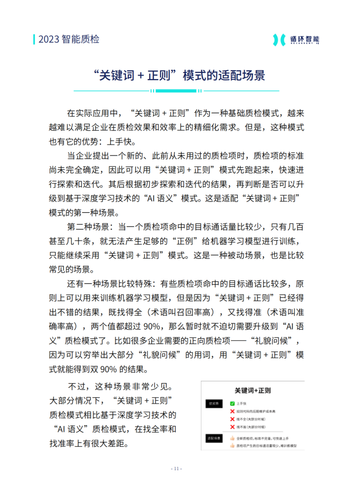 市面上有很多面向销售和客服人员的语音、文本质检系统,其他绝大部分产品使用的是基于“关键词+正则表达式”实现方式。由于漏检和错检问题严重,单纯地依靠这类质检方式,越来越难以满足企业的实际需求。