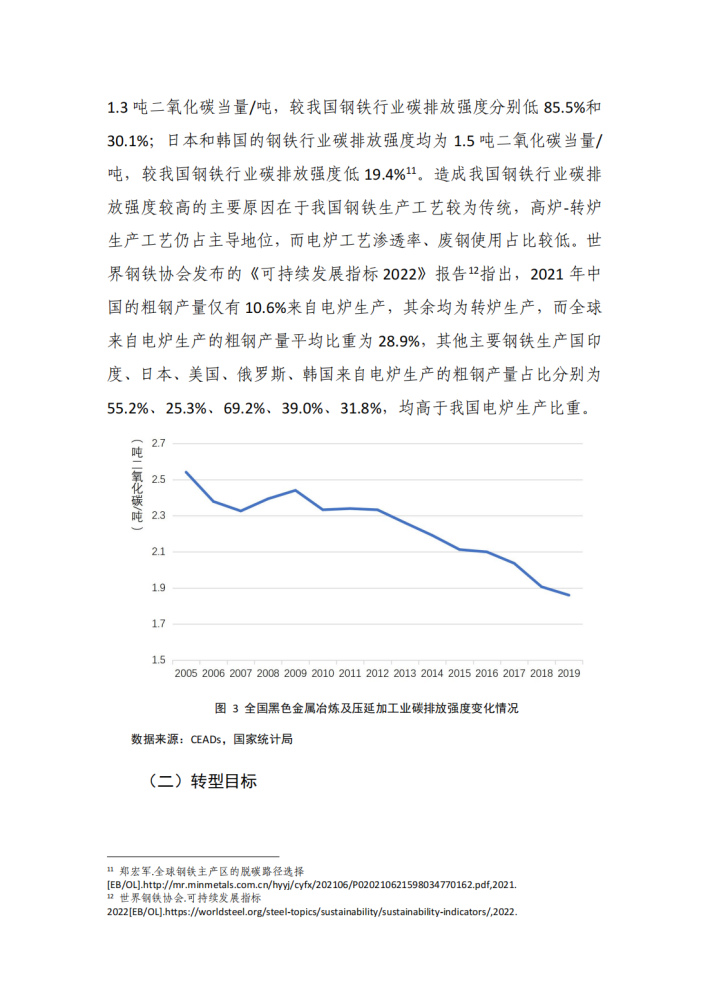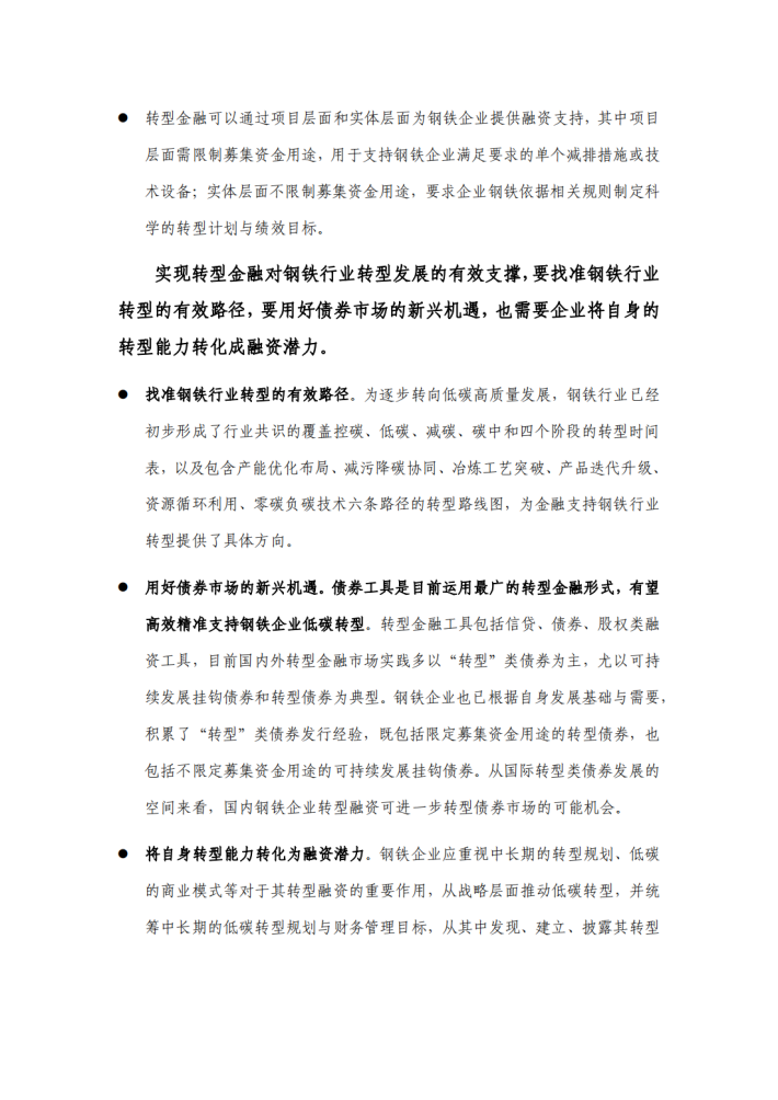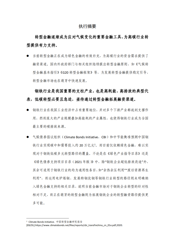 本指引将首先介绍转型金融的发展历程与市场现状。其次,梳理钢铁行业低碳转型的现状、钢铁行业低碳转型的具体目标,以厘清产业视角下的转型路径与路径潜力。在此基础上,落脚到钢铁企业与金融机构联动的维度,提出钢铁企业转型金融应用指引,包括具体应用场景、目标设定方式、可用金融工具,并展示了典型债务类转型金融融资工具的案例,以期为构建钢铁行业与金融机构对话的桥梁提供支持。
