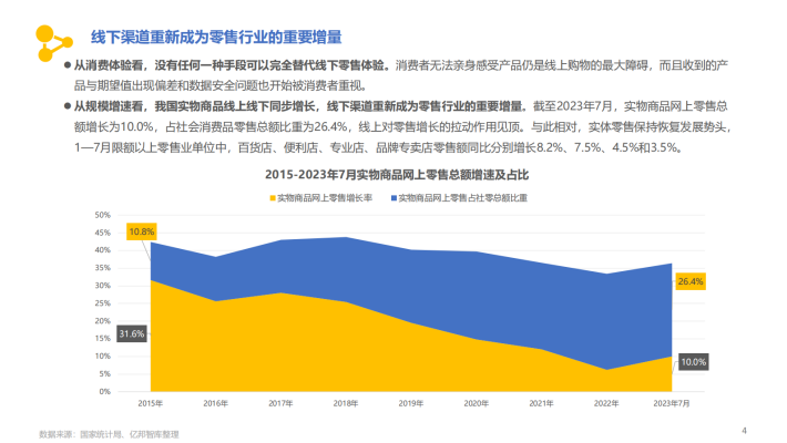 从规模增速看,我国实物商品线上线下同步增长,线下渠道重新成为零售行业的重要增量。截至2023年7月,实物商品网上零售总