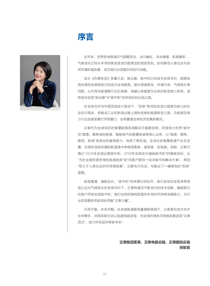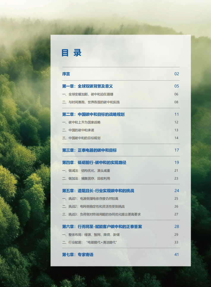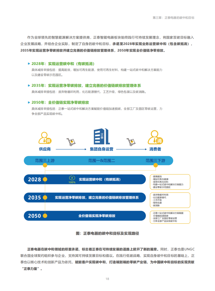 正泰作为全球知名的智慧能源系统解决方案提供商,积极助力世界“碳中和“愿景,聚焦绿色能源、智能电气和智慧低碳等核心业务,以”绿源、智网、降荷、新储”系统化的服务能力,构筑了跨区域、全球化的智慧能源产业生态圈,在绿色低碳发展的新蓝海中争做探索者、倡导者、实践者。目前,正泰已确立“2028年实现运营碳中和,2050年实现全价值链碳中和”的降碳目标,从“为社会提供更多绿色能源选择”到“向客户提供一站式碳中和解决方案”,再到“致力于人类社会的可持续发展”,正泰先行先试,勾勒出了一幅绿色的“双碳”“蓝图。