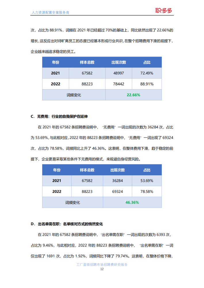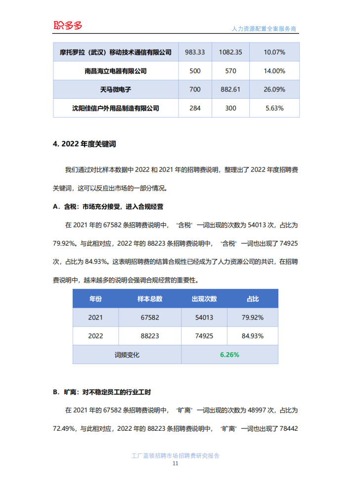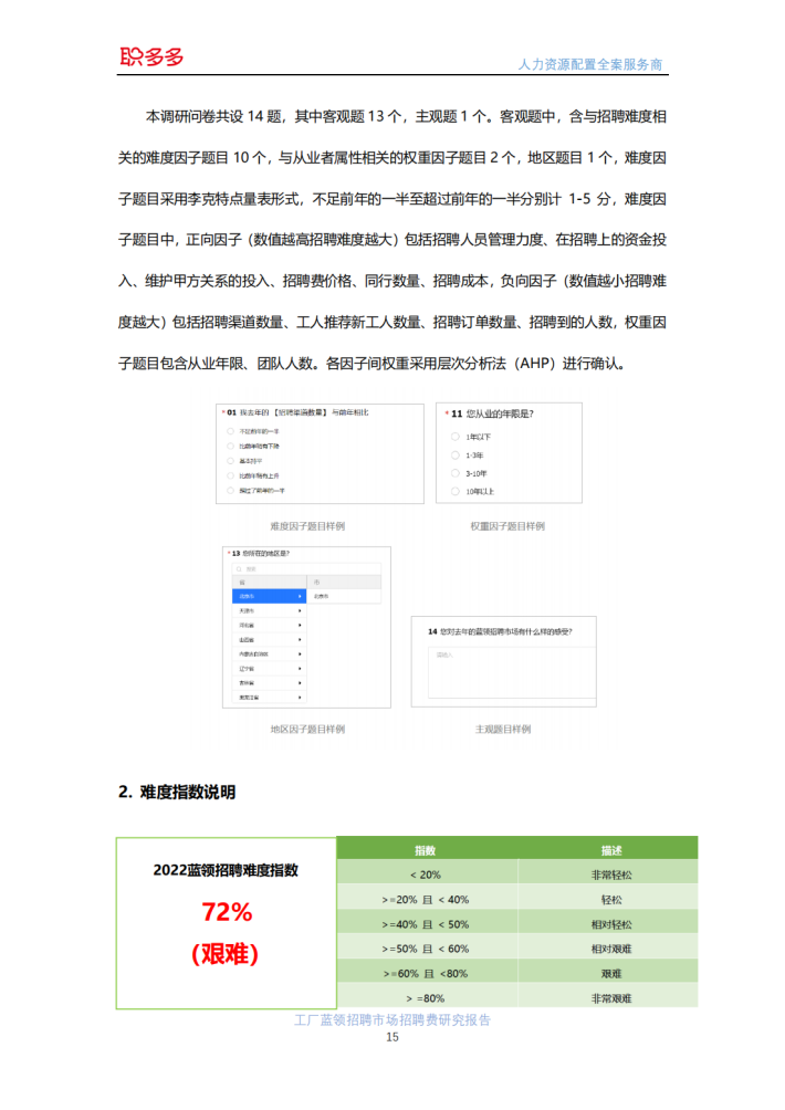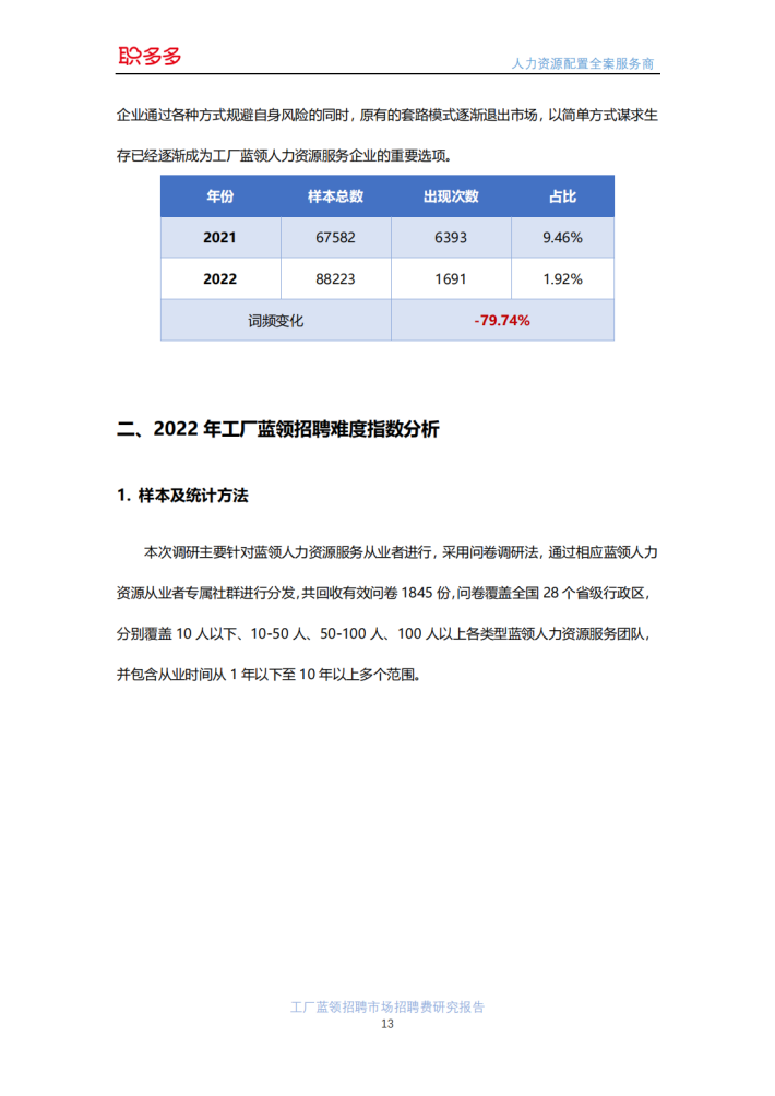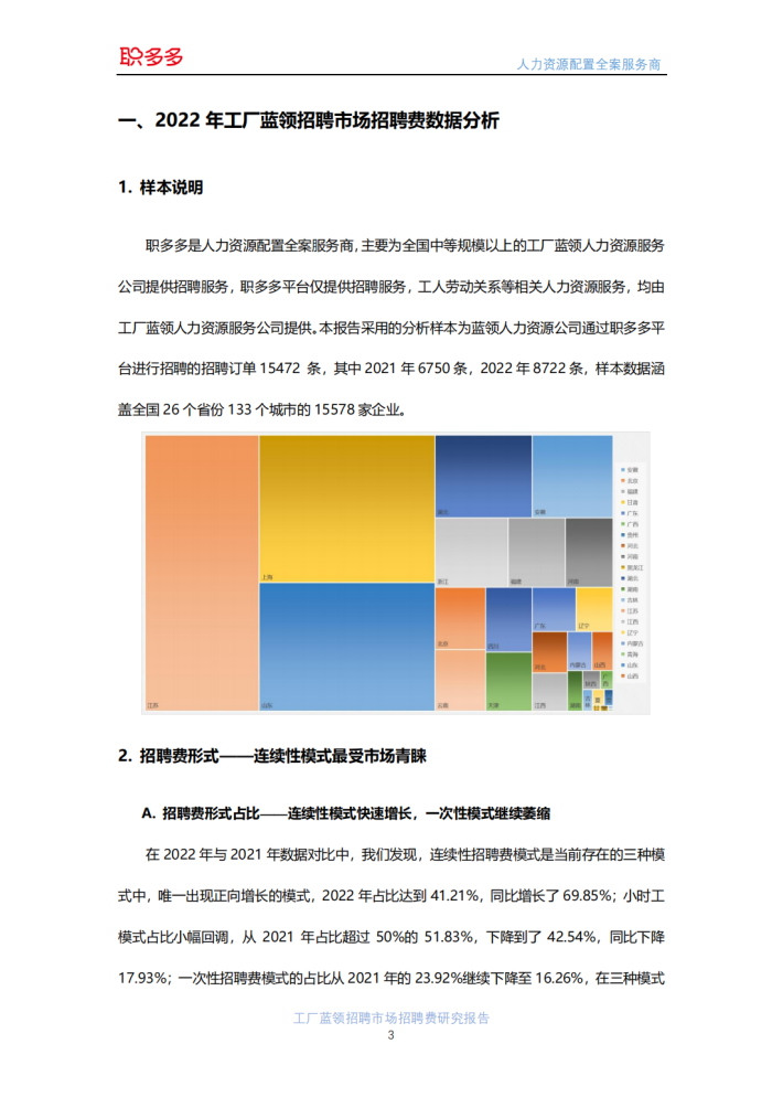 职多多是人力资源配置全案服务商,主要为全国中等规模以上的工厂蓝领人力资源服务公司提供招聘服务,职多多平台仅提供招聘服务,工人劳动关系等相关人力资源服务,均由工厂蓝领人力资源服务公司提供。本报告采用的分析样本为蓝领人力资源公司通过职多多平台进行招聘的招聘订单15472条,其中2021年6750条,2022年8722条,样本数据涵盖全国26个省份133个城市的15578家企业。