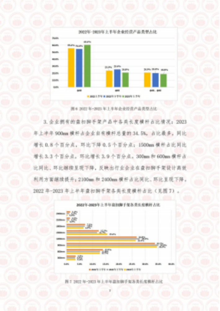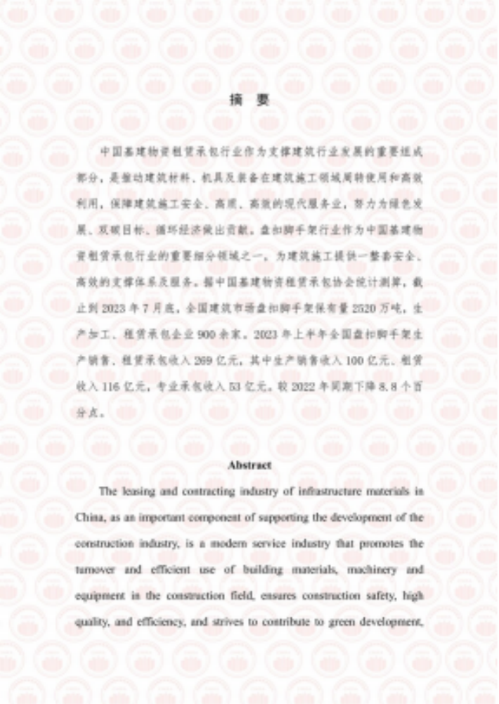中国基建物资租赁承包行业作为支撑建筑行业发展的重要组成部分,是推动建筑材料、机具及装备在建筑施工领域周转使用和高效利用,保障建筑施工安全、高质、高效的现代服务业,努力为绿色发展、双碳目标、循环经济做出贡献。盘扣脚手架行业作为中国基建物资租赁承包行业的重要细分领域之一,为建筑施工提供一整套安全、高效的支撑体系及服务。据中国基建物资租赁承包协会统计测算,截止到2023年7月底,全国建筑市场盘扣脚手架保有量2520万吨,生产加工、租赁承包企业900余家。2023年上半年全国盘扣脚手架生产销售、租赁承包收入269亿元,其中生产销售收入100亿元、租赁收入116亿元,专业承包收入53亿元。较2022年同期下降8.8个百分点。