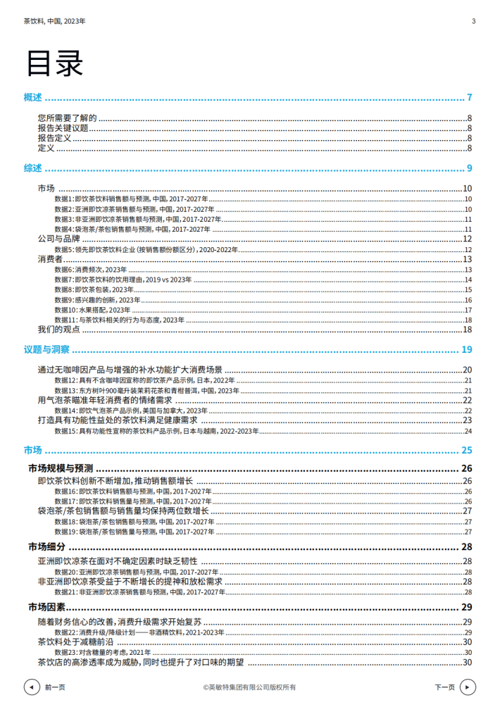 《中国居民膳食指南(2022)》强调了足量饮水的重要性。该指南还推荐饮用白水或茶水,少喝或不喝含糖饮料,以及不用饮料代替白水,这表明茶饮料在满足日常补水需求方面存在市场机遇。