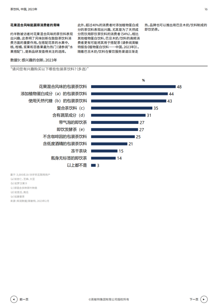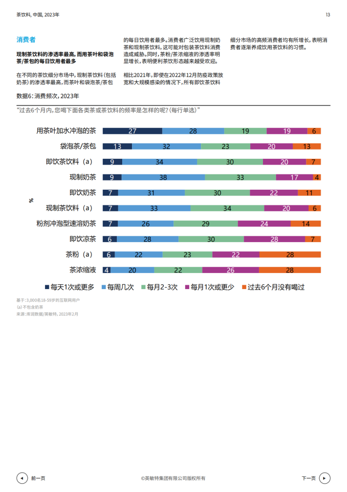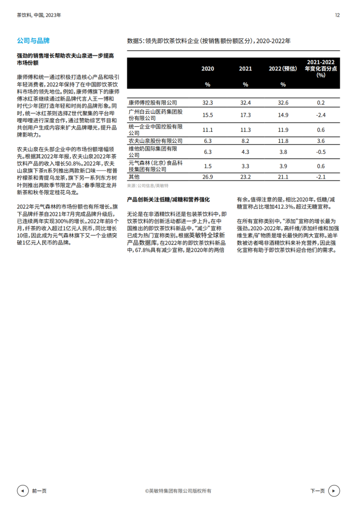根据英敏特报告《菜单洞察——茶饮店——中国,2023年》,虽然受到新冠疫情影响,2022年茶饮店总销售额仍达到1,713亿元人民币,年增长率达19.2%。现制茶饮料(包括奶茶)的消费渗透率在茶饮中也处于领先地位,表明包装茶饮料的消费面临潜在威胁。