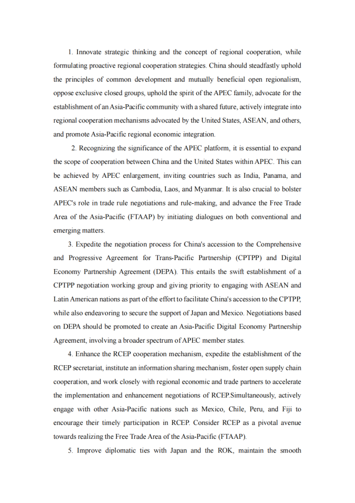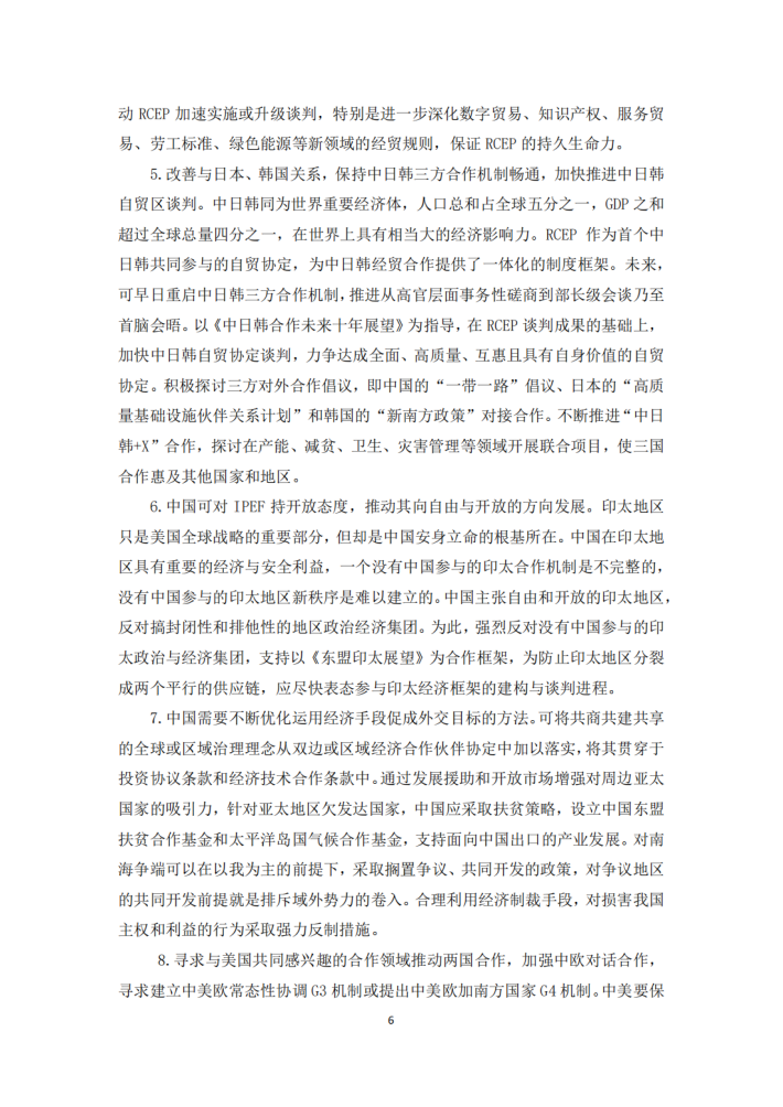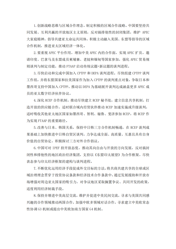 4.深化RCEP合作机制,推动尽快建立RCEP秘书处,建立信息共享机制,打造开放的供应链合作,适时联合域内经贸伙伴推动RCEP加速实施或升级谈判,适时吸收其他亚太地区国家如墨西哥、智利、秘鲁、斐济参加RCEP,将RCEP作为实现FTAAP的重要路径。