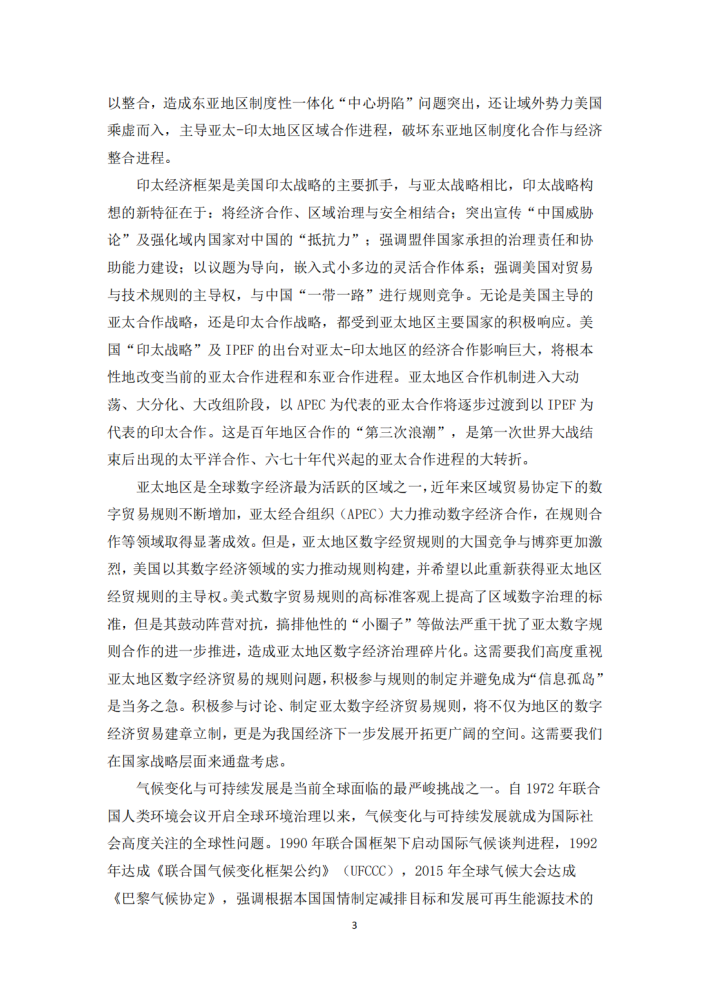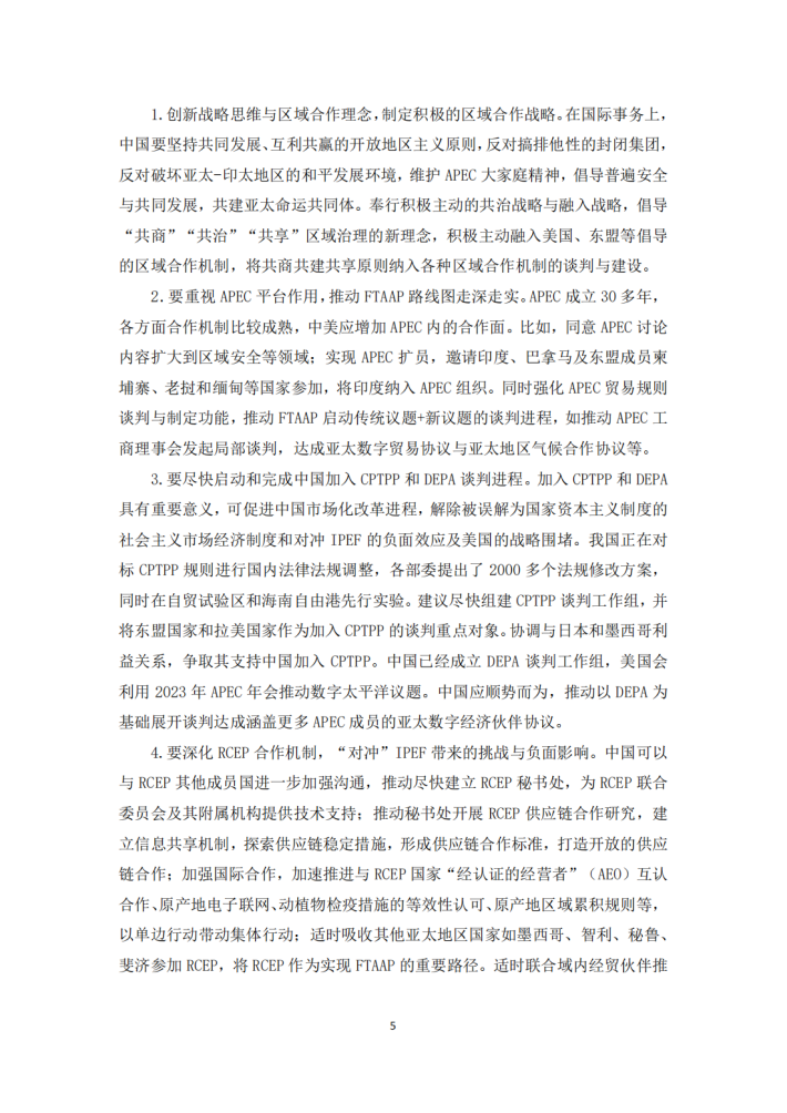 6.中国可对IPEF持开放态度,推动其向自由与开放的方向发展,反对搞封闭性和排他性的地区政治经济集团,支持以《东盟印太展望》为合作框架,尽快表态参与印太经济框架的建构与谈判进程。