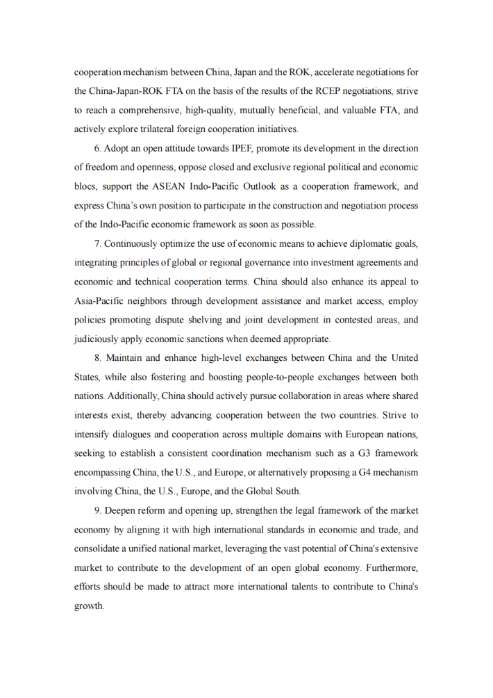 7.不断优化运用经济手段促成外交目标的方法,将共商共建共享的全球或区域治理理念贯穿于投资协议条款和经济技术合作条款中,通过发展援助和开放市场增强对周边亚太国家的吸引力,对争议地区采取搁置争议、共同开发的政策,适度利用经济制裁手段。