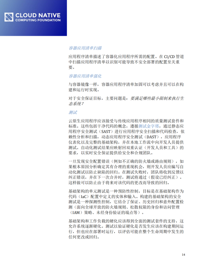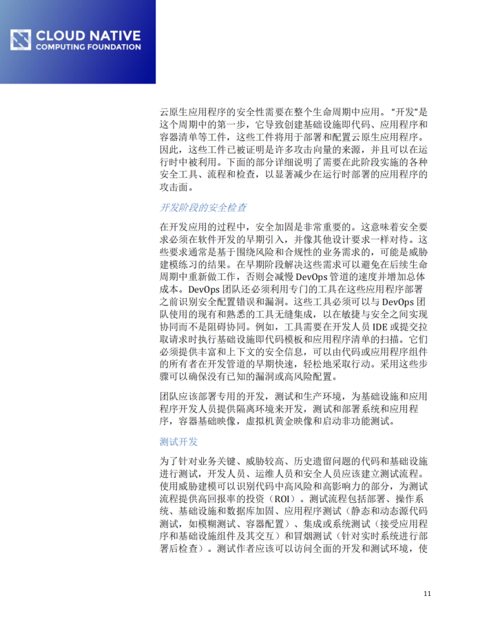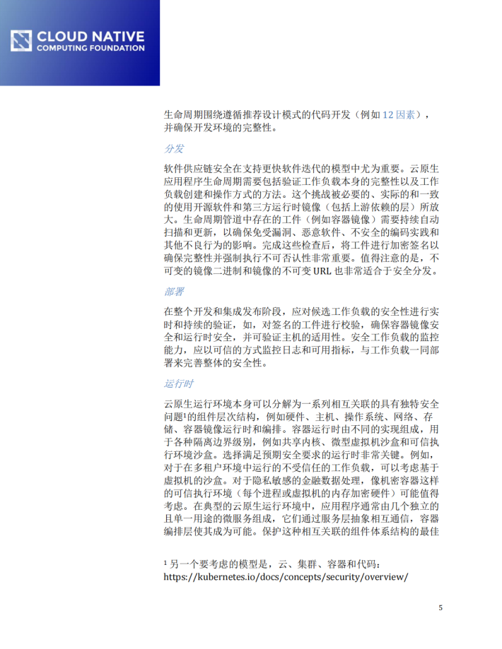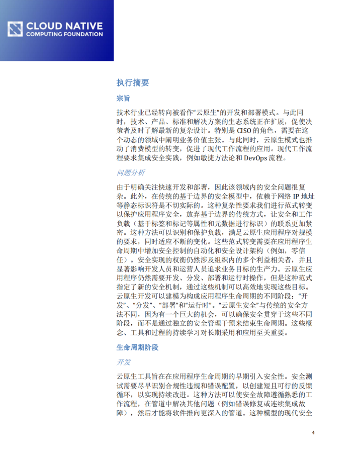 由于明确关注快速开发和部署,因此该领域内的安全问题很复杂。此外,在传统的基于边界的安全模型中,依赖于网络IP地址等静态标识符是不切实际的。这种复杂性要求我们进行范式转变以保护应用程序安全,放弃基于边界的传统方式,让安全和工作负载(基于标签和标记等属性和元数据进行标识)的联系更加紧密。这种方法可以识别和保护负载,满足云原生应用程序对规模的要求,同时适应不断的变化。这些范式转变需要在应用程序生命周期中增加安全控制的自动化和安全设计架构(例如,零信任)。安全实现的权衡仍然涉及组织内的多个利益相关者,并且显著影响开发人员和运营人员追求业务目标的生产力。云原生应用程序仍然需要开发、分发、部署和运行时操作,但是这种范式指定了新的安全机制,通过这些机制可以高效地实现这些目标。云原生开发可以建模为构成应用程序生命周期的不同阶段:“开发”、“分发”、“部署”和“运行时”。“云原生安全”与传统的安全方法不同,因为有一个巨大的机会,可以确保安全贯穿于这些不同阶段,而不是通过独立的安全管理干预来结束生命周期。这些概念、工具和过程的持续学习对长期采用和应用至关重要。