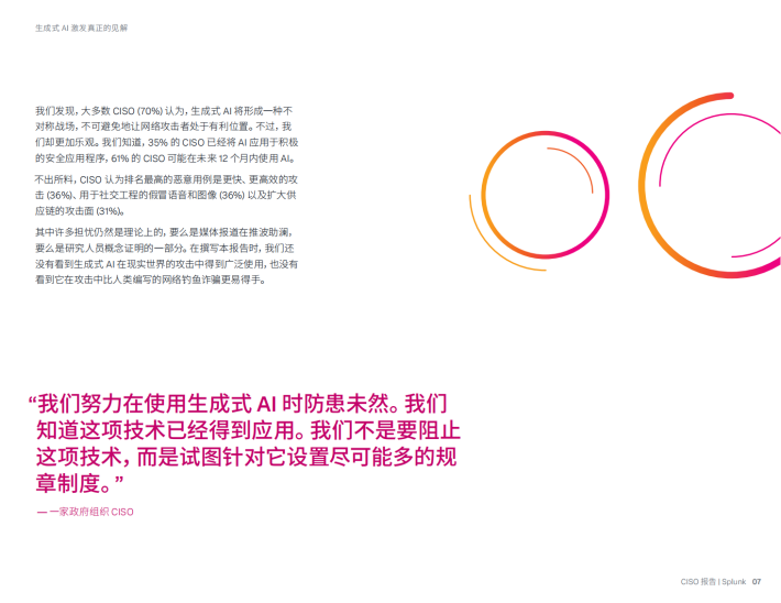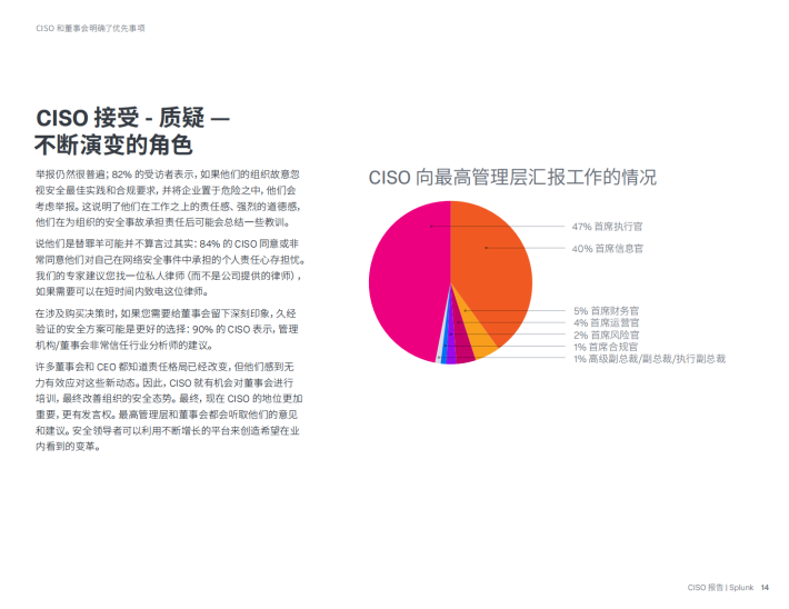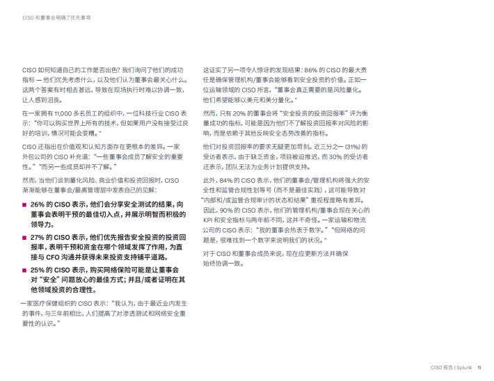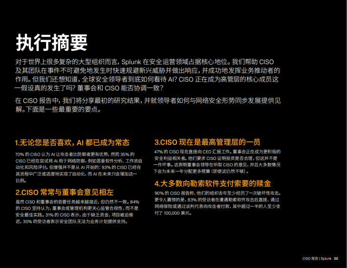 对于世界上很多复杂的大型组织而言,Splunk在安全运营领域占据核心地位。我们帮助CISO及其团队在事件不可避免地发生时快速规避新兴威胁并做出响应,并成功地发挥业务推动者的作用。但我们还想知道,全球安全领导者到底如何看待Al?CISO正在成为高管层的核心成员这一假设真的发生了吗?董事会和CISO能否协调一致?