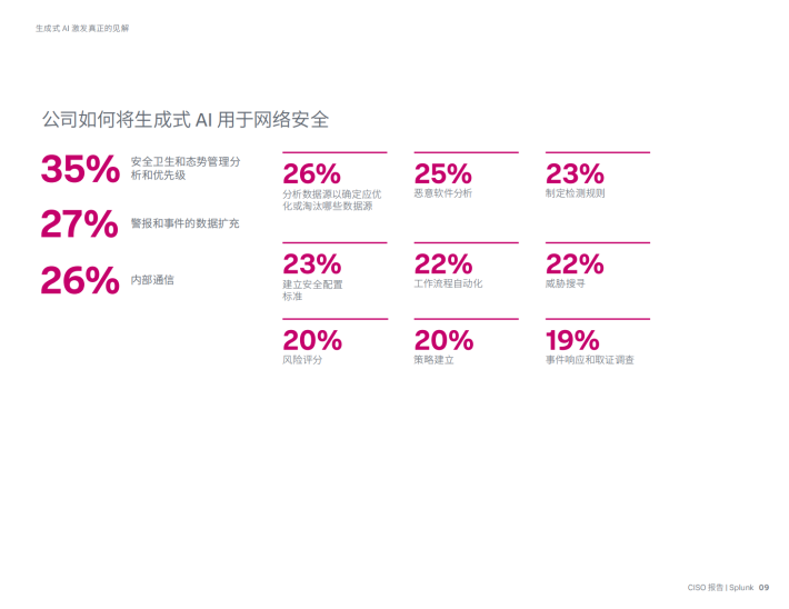 70%的CISO认为Al让攻击者比防御者更有优势,然而35%的CISO已经在尝试将Al用于网络防御,例如恶意软件分析、工作流自动化和风险评分。但增强并不是从Al开始的:93%的CISO已经在其流程中广泛或适度地实现了自动化,而Al在未来只会增加这一比例。