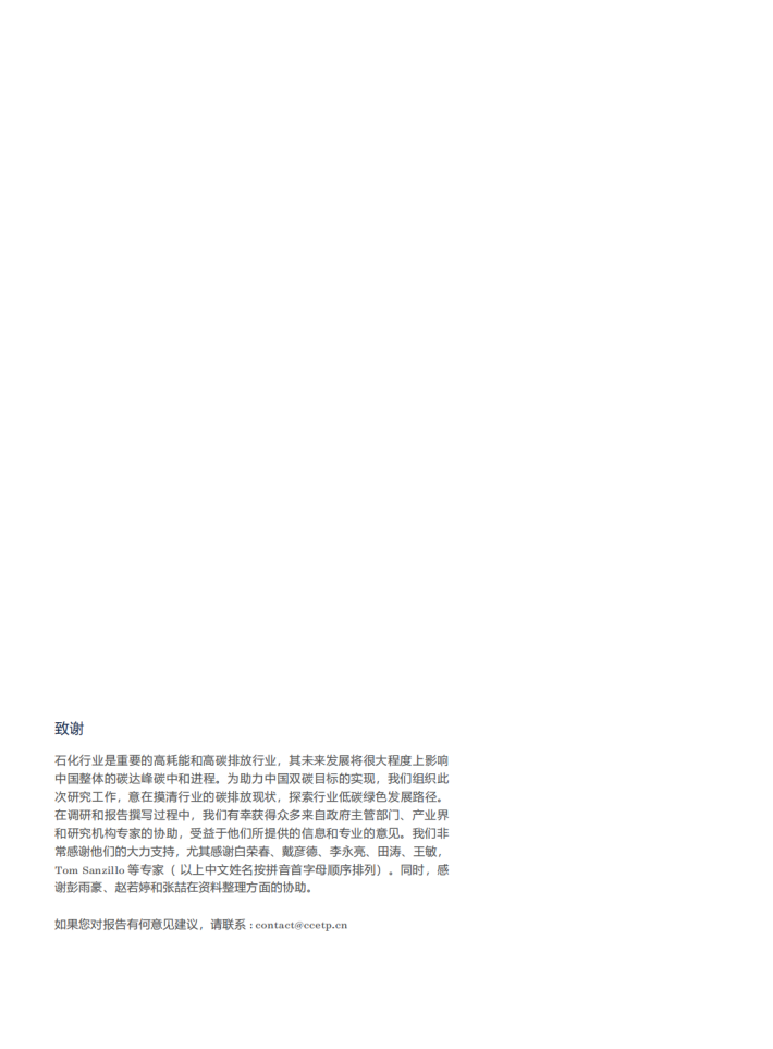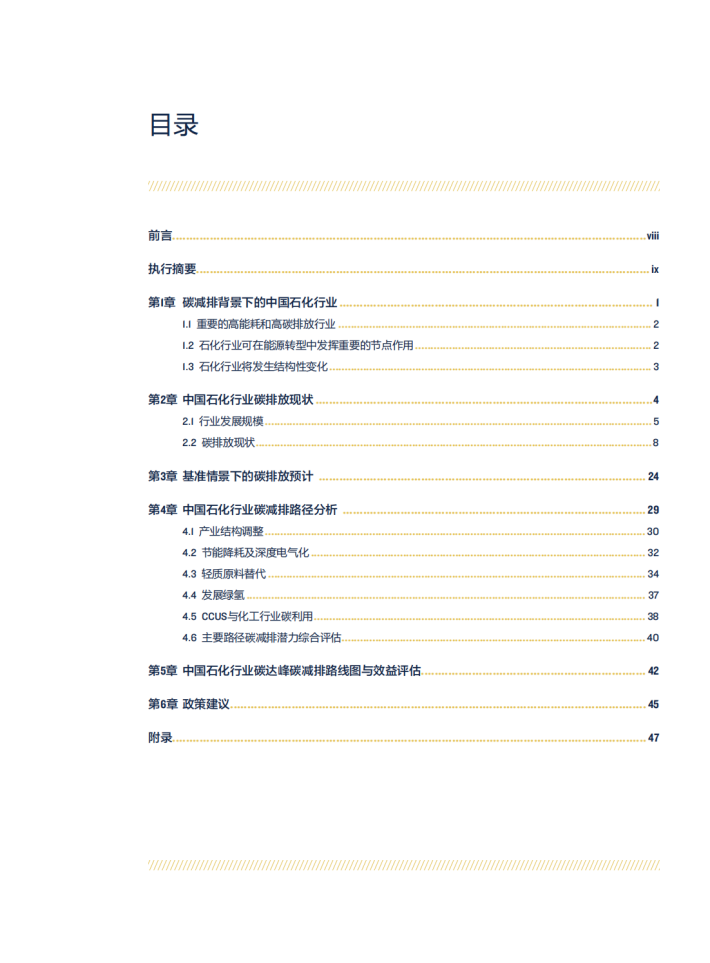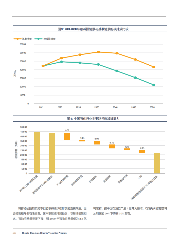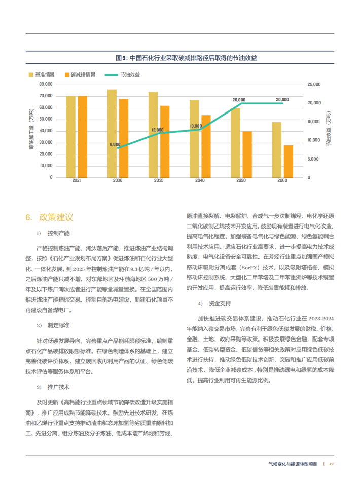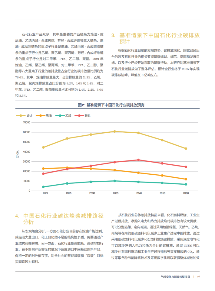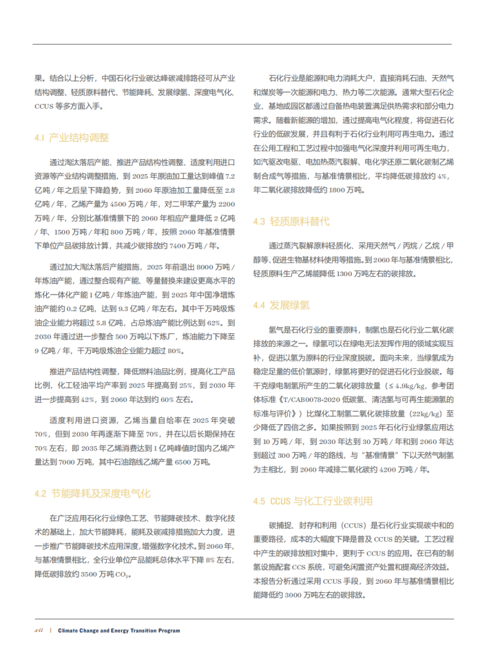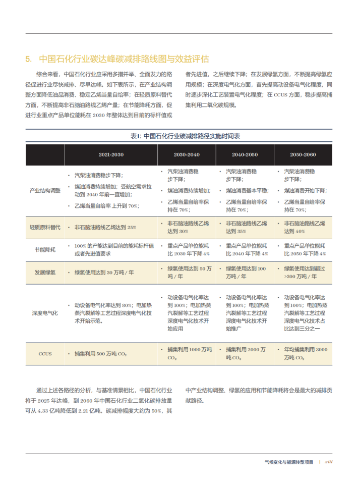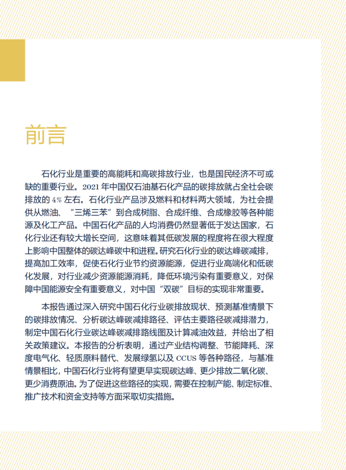 本报告通过深入研究中国石化行业碳排放现状、预测基准情景下的碳排放情况、分析碳达峰碳减排路径、评估主要路径碳减排潜力,制定中国石化行业碳达峰碳减排路线图及计算减油效益,并给出了相关政策建议。本报告的分析表明,通过产业结构调整、节能降耗、深度电气化、轻质原料替代、发展绿氢以及CCUS等各种路径,与基准情景相比,中国石化行业将有望更早实现碳达峰、更少排放二氧化碳、更少消费原油。为了促进这些路径的实现,需要在控制产能、制定标准、推广技术和资金支持等方面采取切实措施。