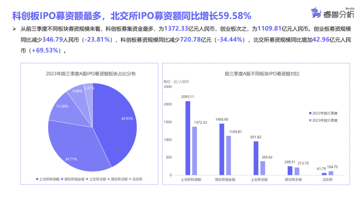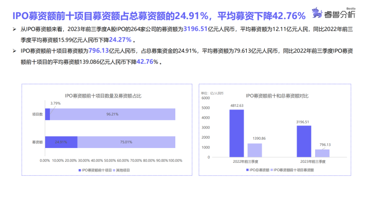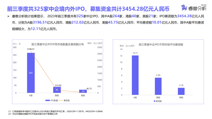 睿兽分析统计结果显示,2023年前三季度共有325家中企IPO,其中A股264家,港股40家,美股21家;IPO募资额为3454.28亿元人民币,分别为A股3196.51亿元人民币、港股212.02亿元人民币、美股45.75亿元人民币;平均募资额10.01亿元人民币,其中A股平均募资规模较大,为12.11亿元人民币。