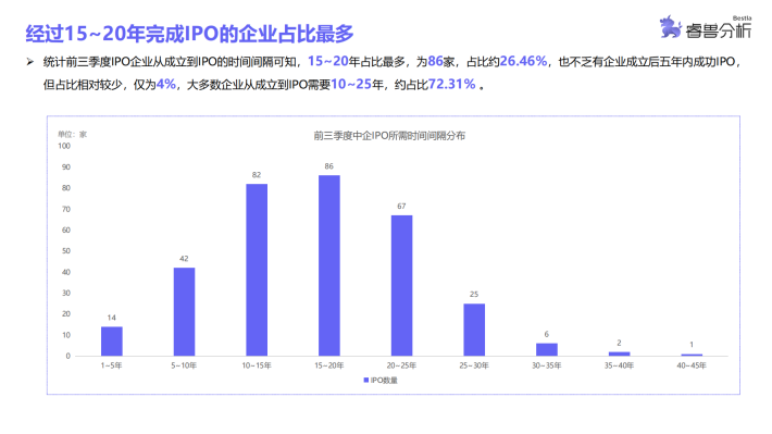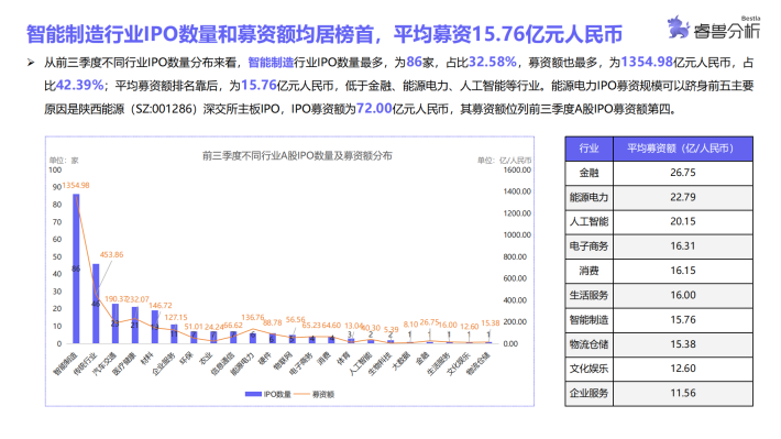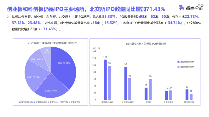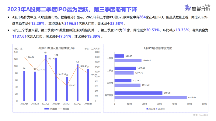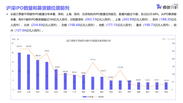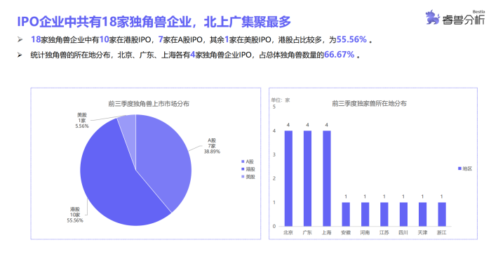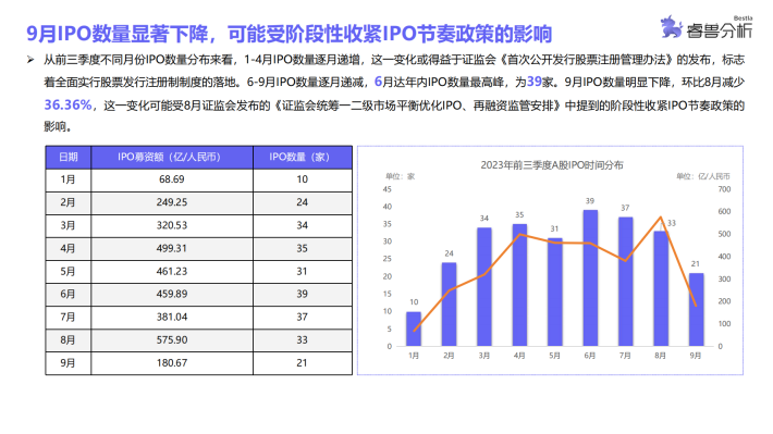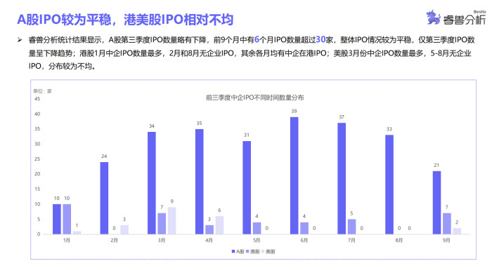 睿兽分析统计结果显示,A股第三季度IPO数量略有下降,前9个月中有6个月IPO数量超过30家,整体IPO情况较为平稳,仅第三季度IPO数量呈下降趋势;港股1月中企IPO数量最多,2月和8月无企业IPO,其余各月均有中企在港IPO;美股3月份中企IPO数量最多,5-8月无企业IPO,分布较为不均。