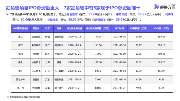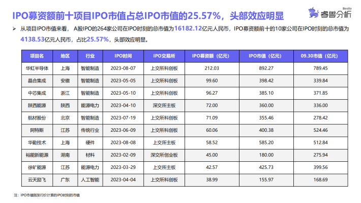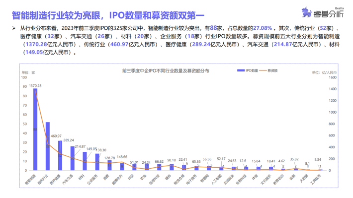 从行业分布来看,2023年前三季度IPO的325家公司中,智能制造行业较为突出,有88家,占总数量的27.08%。其次,传统行业(52家)、医疗健康(32家)、汽车交通(26家)、材料(20家)、企业服务(18家)行业IPO数量较多。募资规模前五大行业分别为智能制造(1370.28亿元人民币)、传统行业(460.97亿元人民币)、医疗健康(289.24亿元人民币)、汽车交通(214.87亿元人民币)、材料(149.05亿元人民币)。