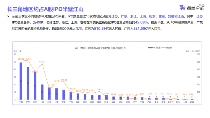 从地区分布来看,2023年前三季度中企IPO数量第一为广东(53家,535.85亿元人民币),有53家。紧随其后是长三角地区的江苏、浙江、上海,分别为:江苏(51家,513.88亿元人民币)、浙江(40家,379.94亿元人民币)、上海(35家,559.46亿元人民币),北京(26家,285.55亿元人民币)以26家企业IPO位列全国第五。