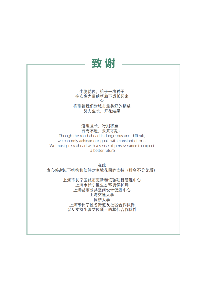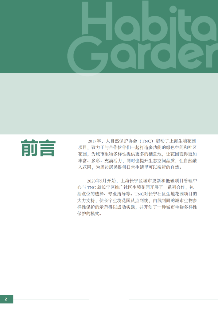 2020年5月开始,上海长宁区城市要新和低碳项日管理中心与TNC就长宁区推广社区生境花园开展了一系列合作,包括点位的逃择、专业指导等。TNC对长宁社区生境花园项目的大力支持,使长宁生境花园从点到线,由线到面的城市生物多样性保护的示范得以成功实践,并开创了一种城市生物多样性保护的模式。