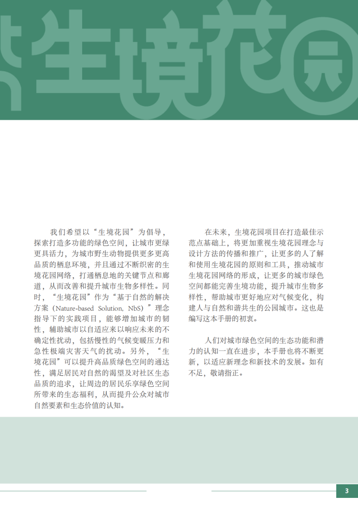 我们希望以“生境花园”为倡导,操索打造多功能的绿色空间,让城市更绿驱具活力,为城市野生动物提供要多更高品质的栖息环境,并且通过不断织密的生境花园网络,打通栖息地的关键节点和廊道,从面改善和提升城市生物多样性。同时,“生境花园”作为“基于自然的解决方案(Natnme basel Soliom,NLs)”理念指导下的实飚项日,能够增加城市的韧性,输助城市以自适应来以响应未来的不确定性扰动,包括慢性的气候变暖压力和急性极端灾害天气的扰动。另外,“生境花园”可以提升高品质绿色密间的通达性,满足居民对自然的褐望及对社区生态品质的追求,让周边的居民乐享绿色空间所带来的生态福利,从面提升公众对城市自然要素和生态价值的认知。
