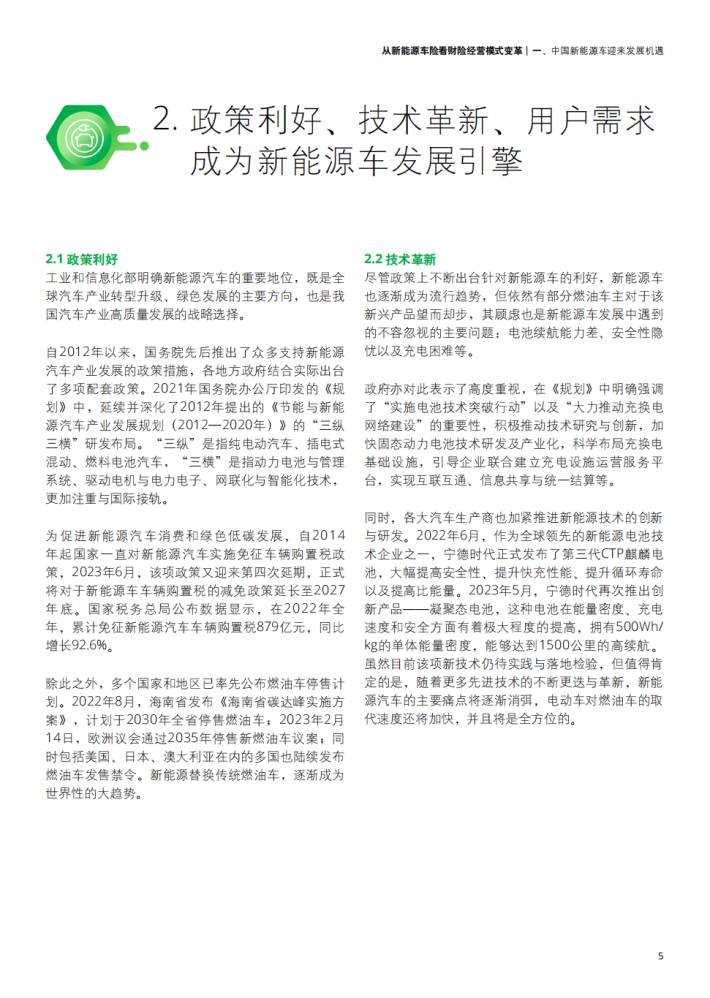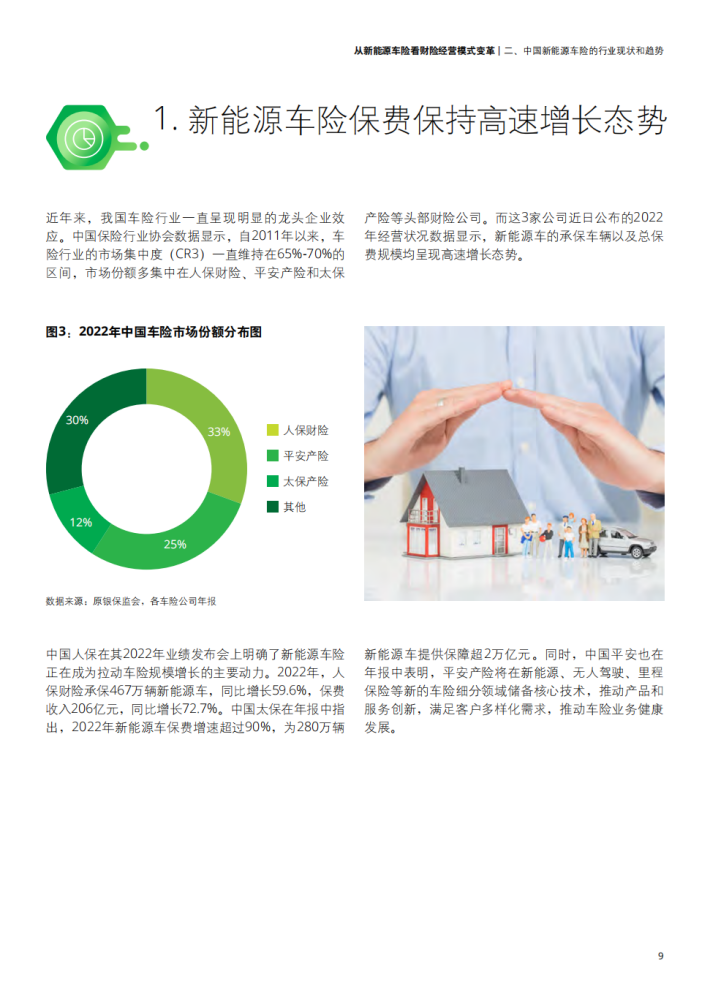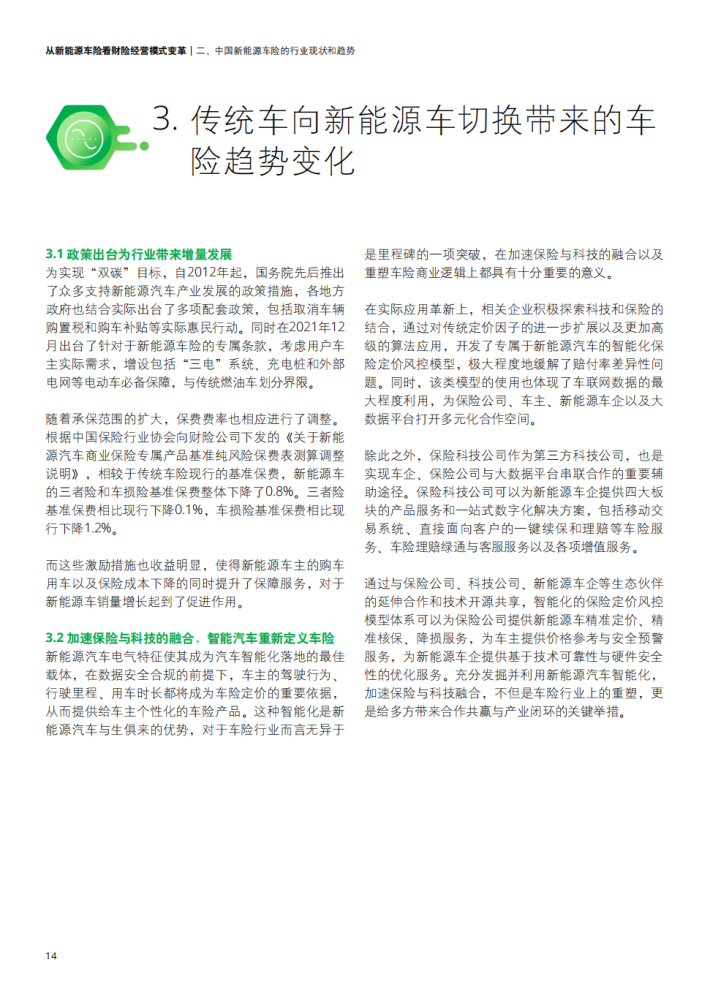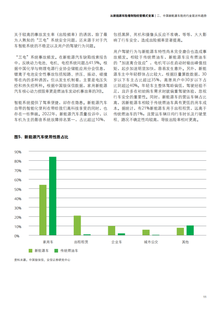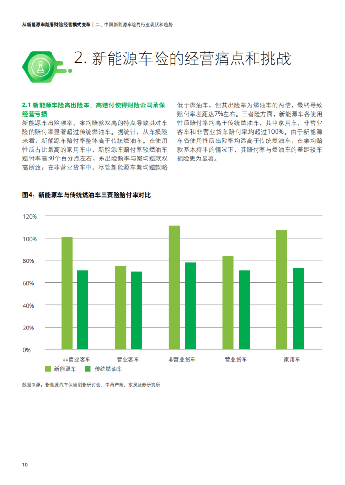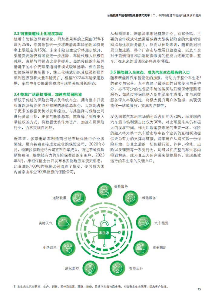 新能源汽车的蓬勃发展给保险市场带来了更多发展机遇,同时也使传统的财险行业面临新能源车险开拓及经营发展难题。一方面,面对不断推陈出新的新能源车型的风险把控难以保证;另一方面,财险行业本身传统的销售渠道、产品开发定价、核保理赔、风险管理已难以满足发展新能源车险的要求。在多方驱动下,汽车行业逐渐布局保险行业并转向包含生产、销售、金融产品、出行服务等一系列环节车生态的建设方向,给财险行业的传统经营模式带来巨大挑战。由此,财险行业应结合用户实际需求探索更多保险创新产品保障,并积极联动生态链中多方角色、推动产业融合,提供更为优质且贯穿车辆使用始终的保障服务,以此应对新能源汽车带来的车险经营变革。