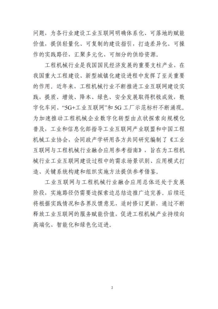 工业互联网与工程机械行业融合应用总体还处于发展阶段,实施路径仍需要边探索边总结边推广边完善。后续还将根据实践情况和各界反馈意见,适时修订更新,通过不断释放工业互联网的服务赋能价值,促进工程机械产业持续向高端化、智能化和绿色化迈进。