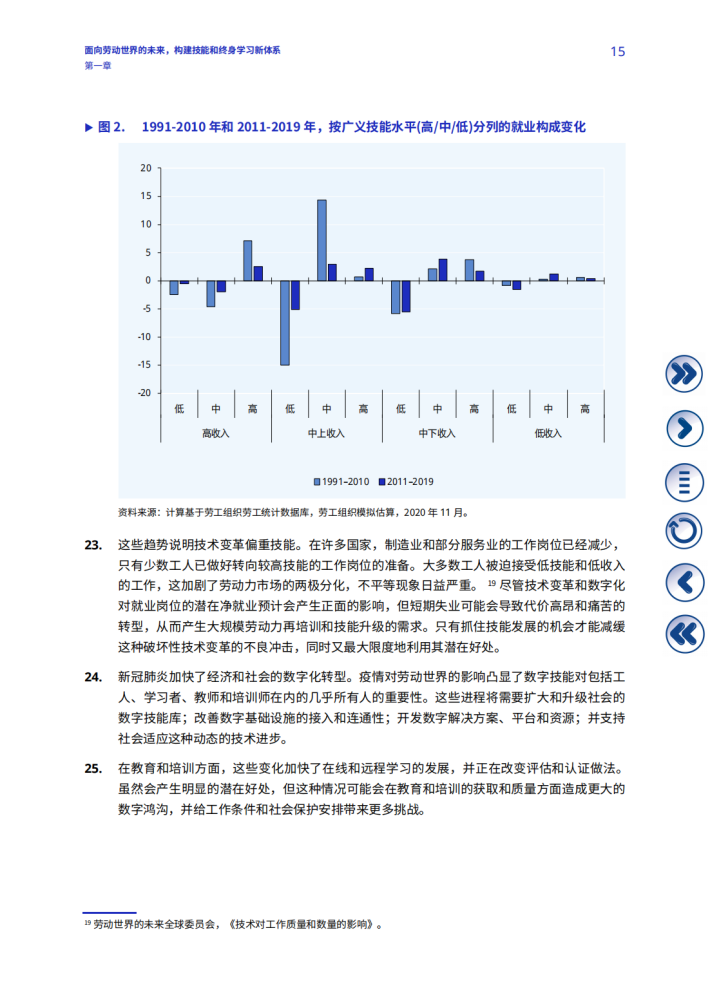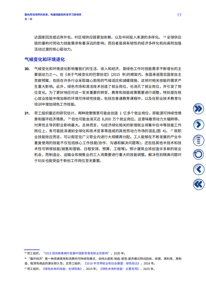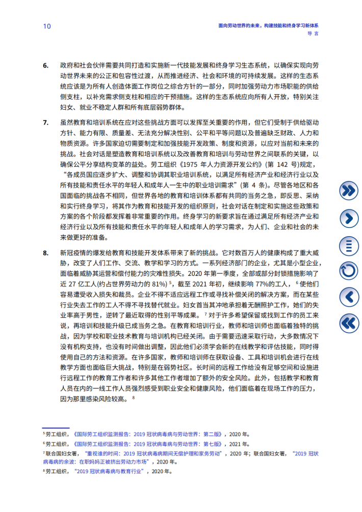 《国际劳工组织关于劳动世界的未来百年宣言》(《百年宣言》)呼吁所有成员国加大对人的能力和劳动机构的投入,以塑造一个公平、包容和安全的劳动世界的未来,为所有人提供充分、生产性和自由选择的就业和体面劳动。这一呼吁在新冠肺炎危机后变得更为重要:技能发展和终身学习在《国际劳工组织2022-2025年战略规划》《2020-2021两年期计划和预算》2以及《2022-2023两年期计划和预算(草案)》中被列为优先事项。技能和终身学习是《百年宣言》中阐述的对劳动世界的未来采取以人为本方针的核心,也是努力确保所有人充分受益于技术进步和其他变革驱动因素的核心,这样就不会有人掉队。