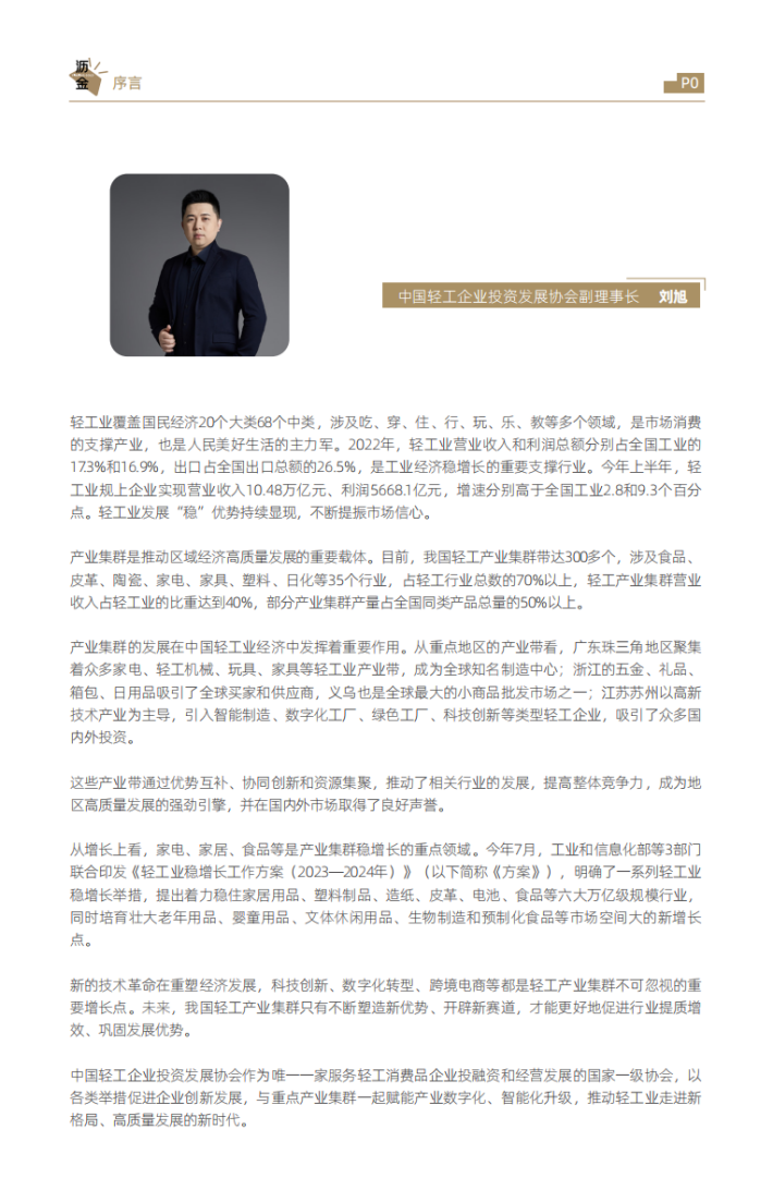 产业集群是推动区域经济高质量发展的重要载体。目前,我国轻工产业集群带达300多个,涉及食品、皮革、陶瓷、家电、家具、塑料、日化等35个行业,占轻工行业总数的70%以上,轻工产业集群营业收入占轻工业的比重达到40%,部分产业集群产量占全国同类产品总量的50%以上。