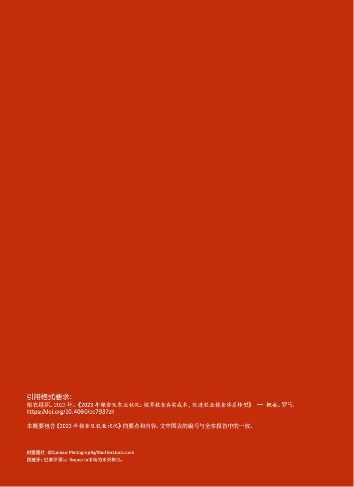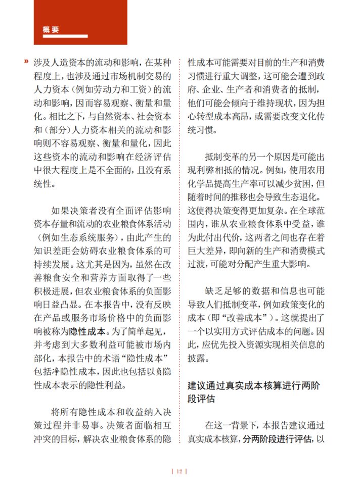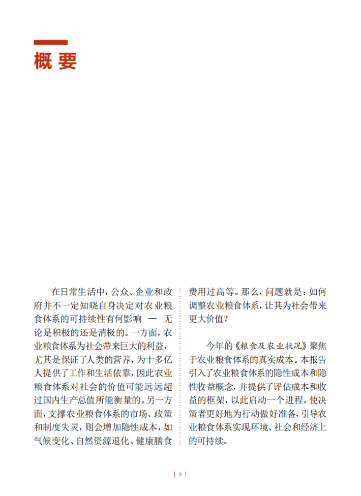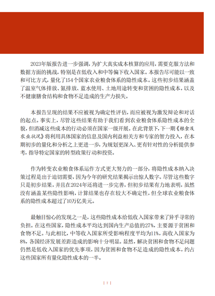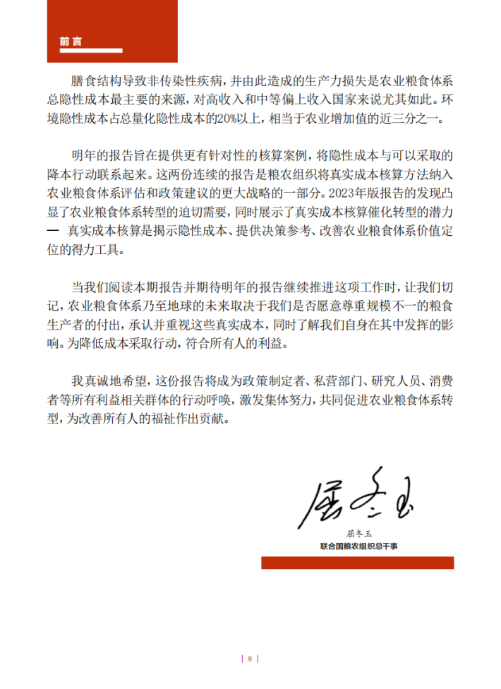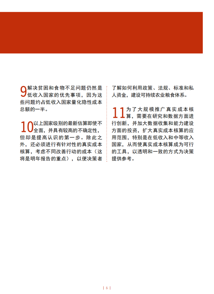 今年的报告以真实成本核算为抓手,揭示了农业粮食体系对环境、健康和生计的潜在影响,以便农业粮食体系行为主体作出知情决策。人们往往会担心,如果考虑粮食生产的所有隐性成本,价格就会上涨。但是,将这些成本纳入决策过程,以及面向生产者和消费者的激励措施,理应是农业粮食体系更广阔转型进程的一部分。真实成本核算旨在支持国家和私营部门做出正确投资决策,降低现有成本,而非使其永久固化。